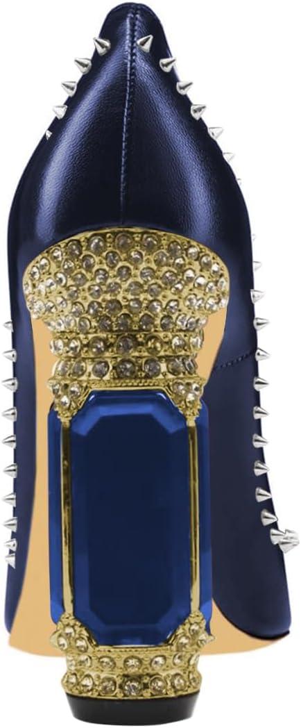 FSJ Women Bridal Pointed Toe Chunky Block High Heel Crystal Pumps Slip on Wedding Thick Comfort Evening Dress Studded Rivets Shoes(Blue Matte Leather)