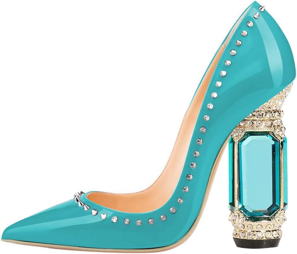 FSJ Women Bridal Pointed Toe Chunky Block High Heel Crystal Pumps Slip on Wedding Thick Comfort Evening Dress Studded Rivets Shoes(Lake Blue)