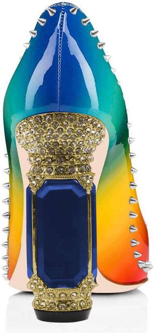 FSJ Women Bridal Pointed Toe Chunky Block High Heel Crystal Pumps Slip on Wedding Thick Comfort Evening Dress Studded Rivets Shoes(Multicolor)