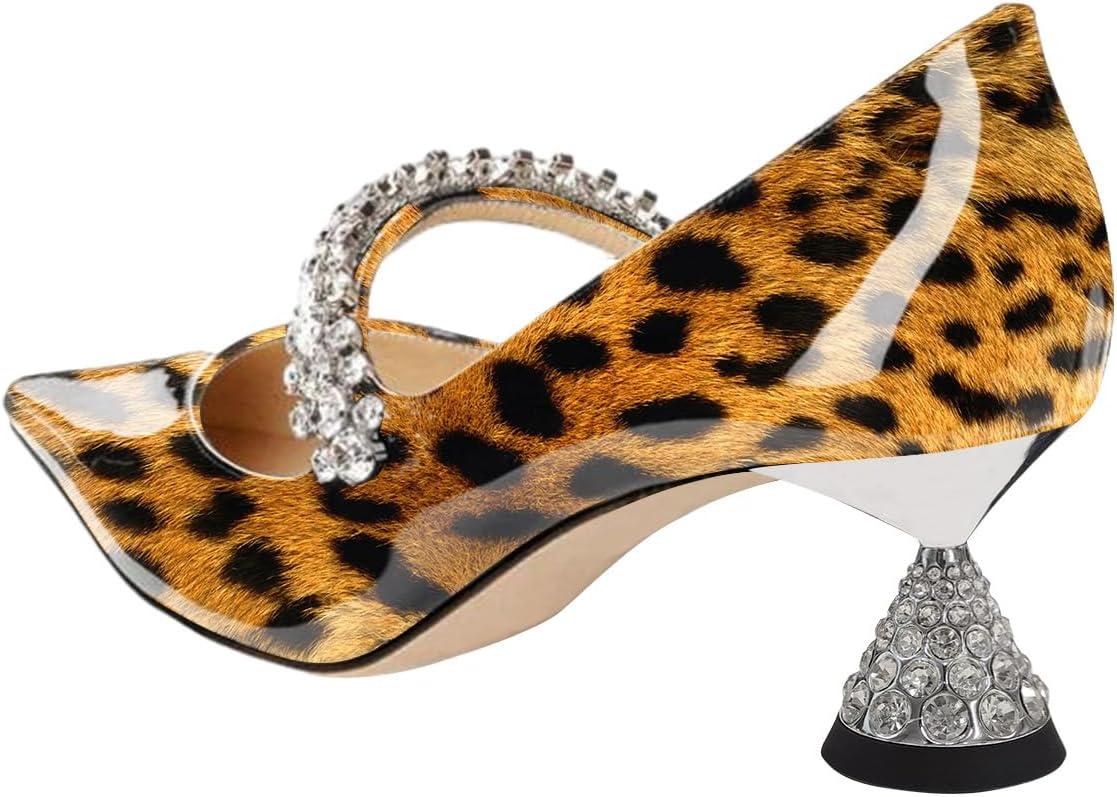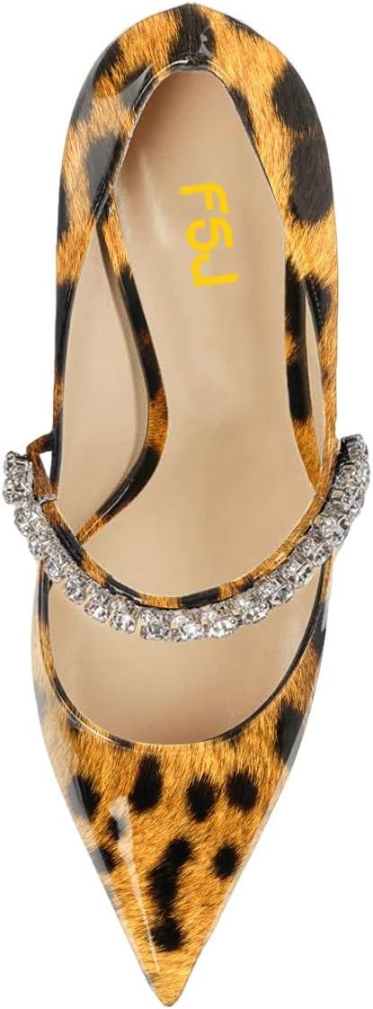 imageFSJ Women Charming Rhinestone Flared Low Heel Pumps Closed Pointed Toe One Strap Slip On Comfortable Work Office Wedding Dance Dress Shoes Size 416 USLeopard Print