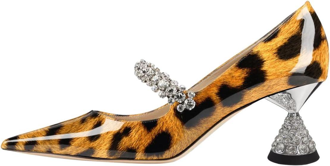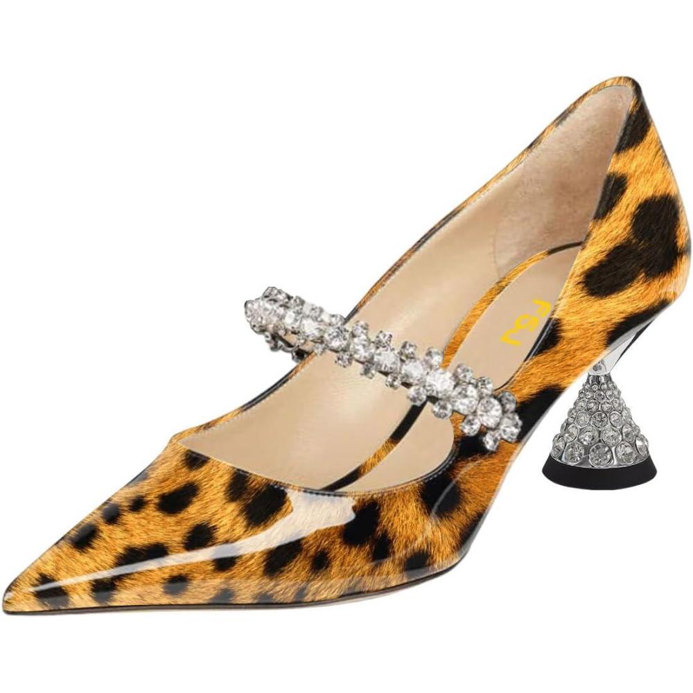 FSJ Women Charming Rhinestone Flared Low Heel Pumps Closed Pointed Toe One Strap Slip On Comfortable Work Office Wedding Dance Dress Shoes Size 4-16 US(Leopard Print)