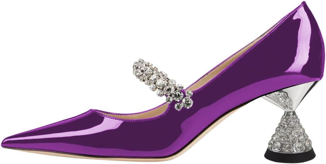 FSJ Women Charming Rhinestone Flared Low Heel Pumps Closed Pointed Toe One Strap Slip On Comfortable Work Office Wedding Dance Dress Shoes Size 4-16 US(Purple)