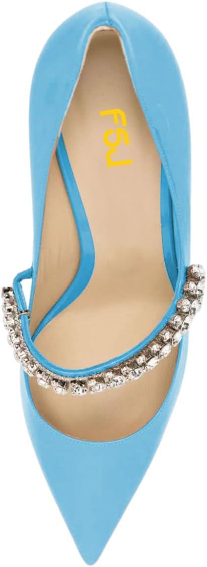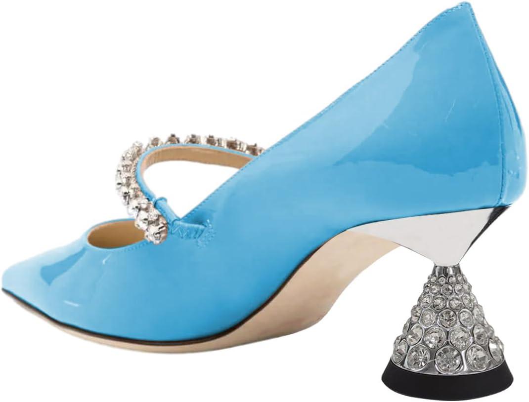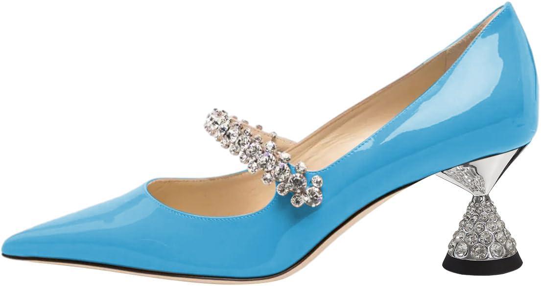 FSJ Women Charming Rhinestone Flared Low Heel Pumps Closed Pointed Toe One Strap Slip On Comfortable Work Office Wedding Dance Dress Shoes Size 4-16 US(Sky Blue)