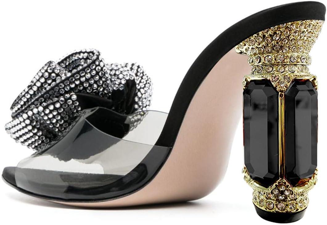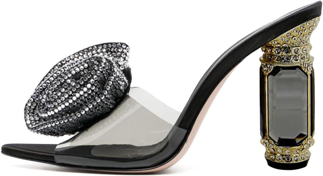 FSJ Women Charming Rose Floral Heel Sandals Clear PVC Band Crystal Chunky Heel Sexy Pointed Peep Toe Slip On Mules Party Prom Wedding Shoes Size 4-16 US(Black Rhinestone)
