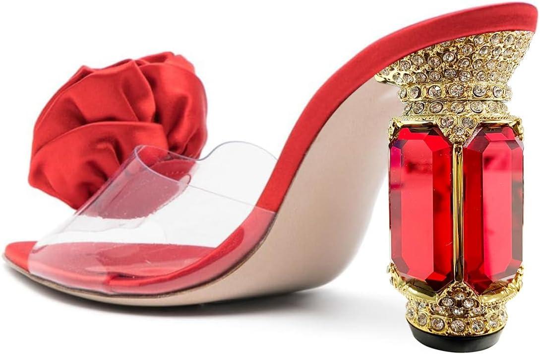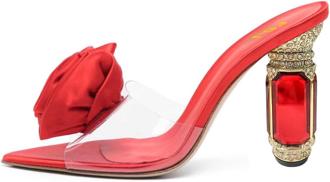FSJ Women Charming Rose Floral Heel Sandals Clear PVC Band Crystal Chunky Heel Sexy Pointed Peep Toe Slip On Mules Party Prom Wedding Shoes Size 4-16 US(Red)