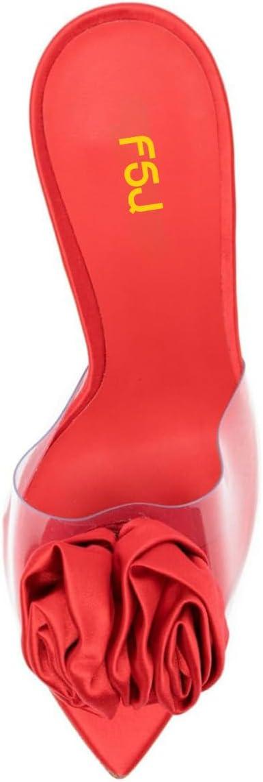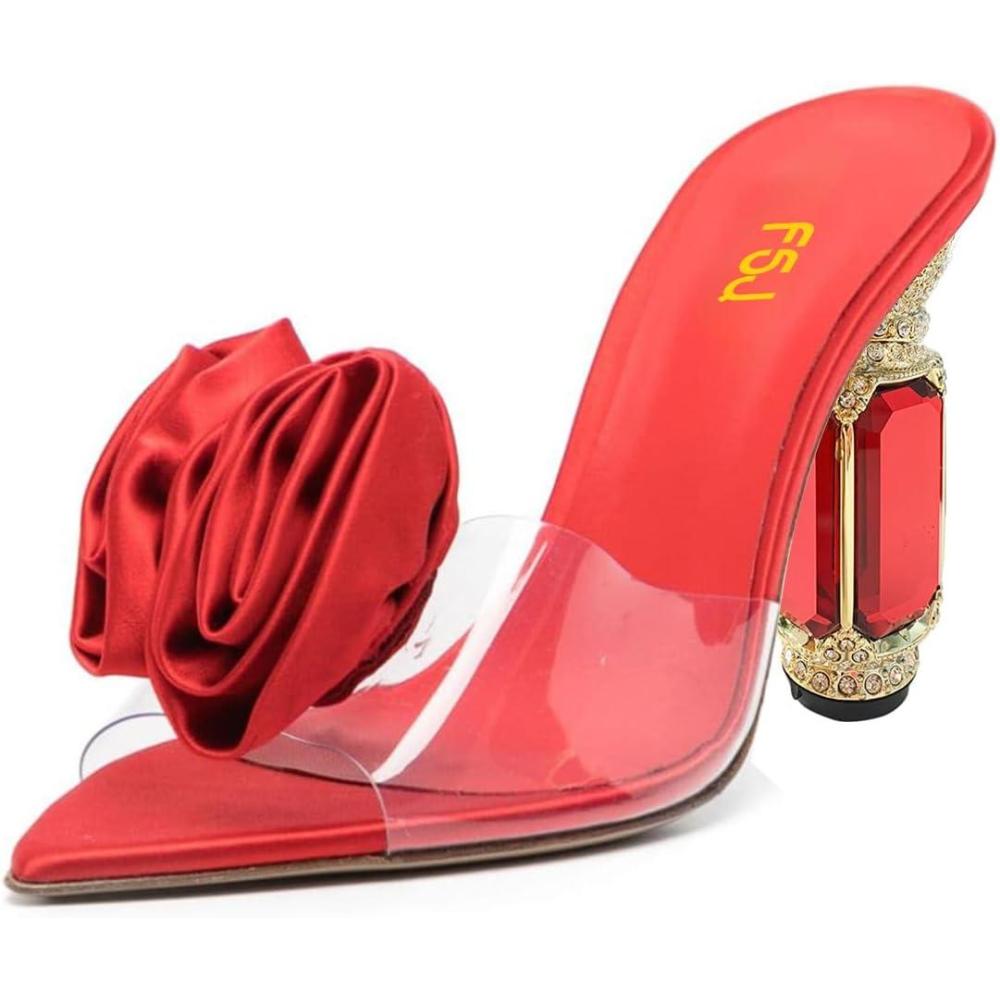 imageFSJ Women Charming Rose Floral Heel Sandals Clear PVC Band Crystal Chunky Heel Sexy Pointed Peep Toe Slip On Mules Party Prom Wedding Shoes Size 416 USRed