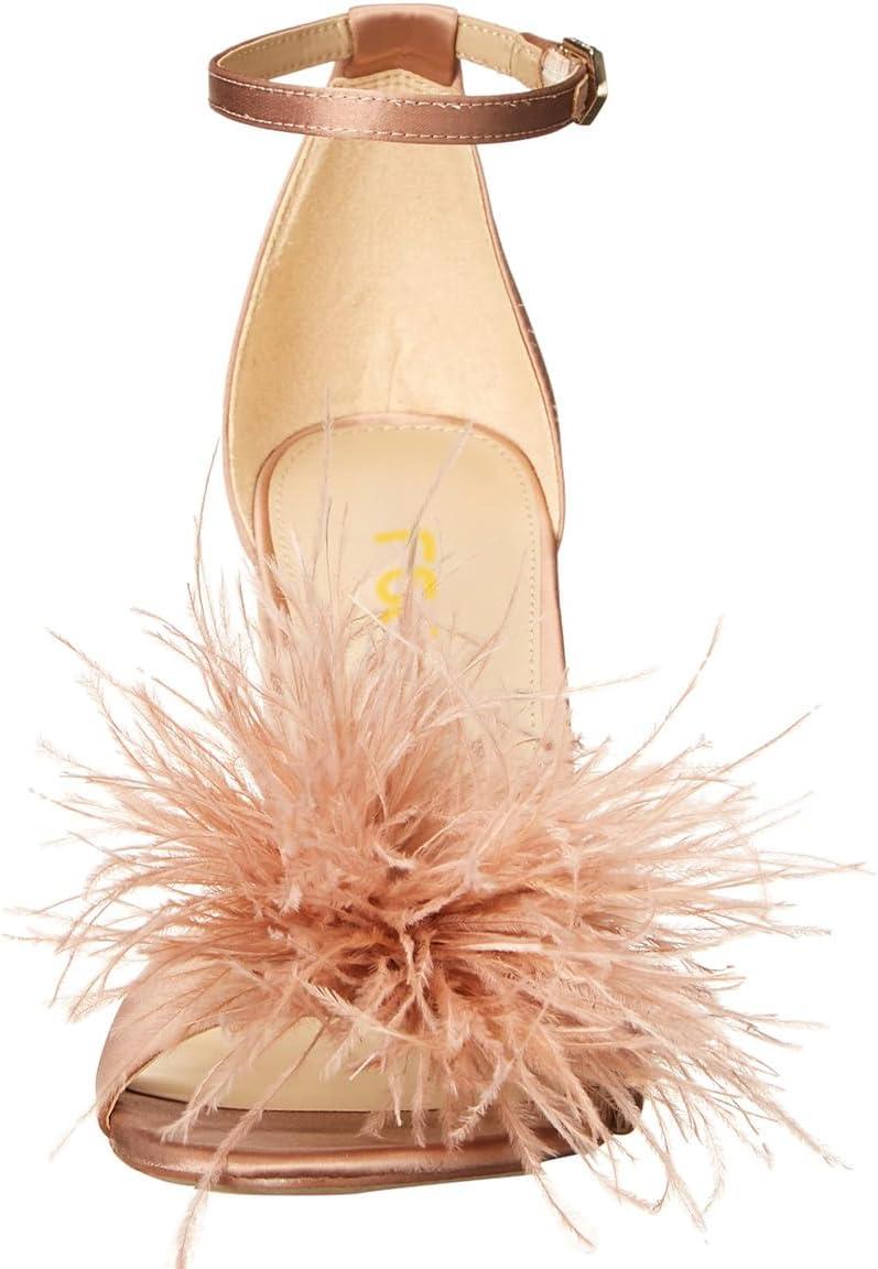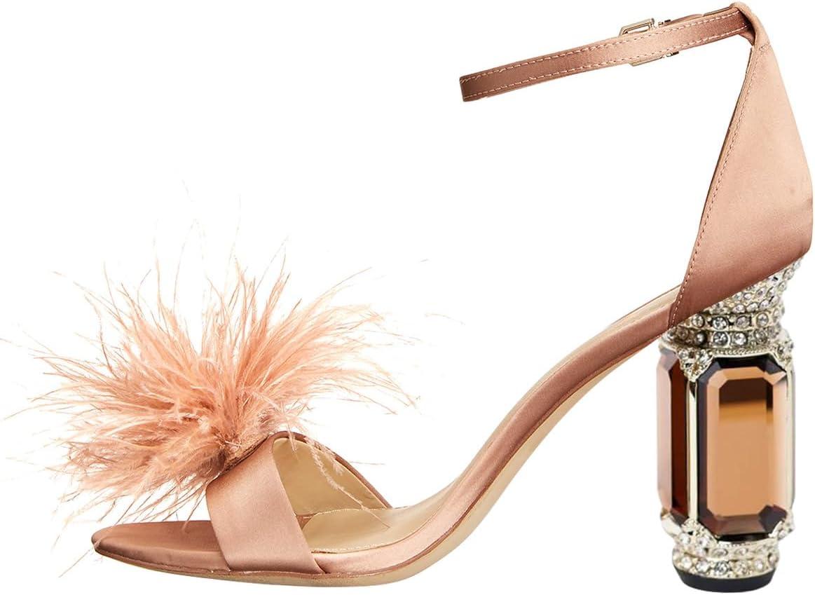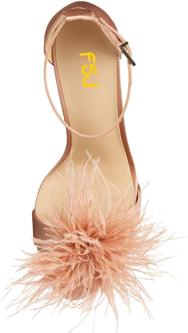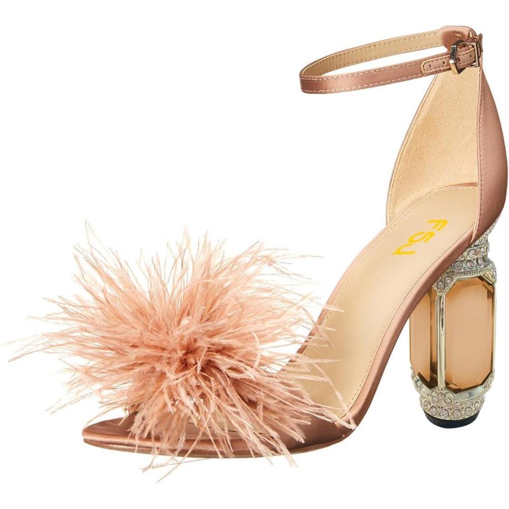 imageFSJ Women Chic Feather Open Toe Ankle Strap Sandals Crystal Block High Heel Furry Wedding Evening Prom Shoes Size 416 USChampagne