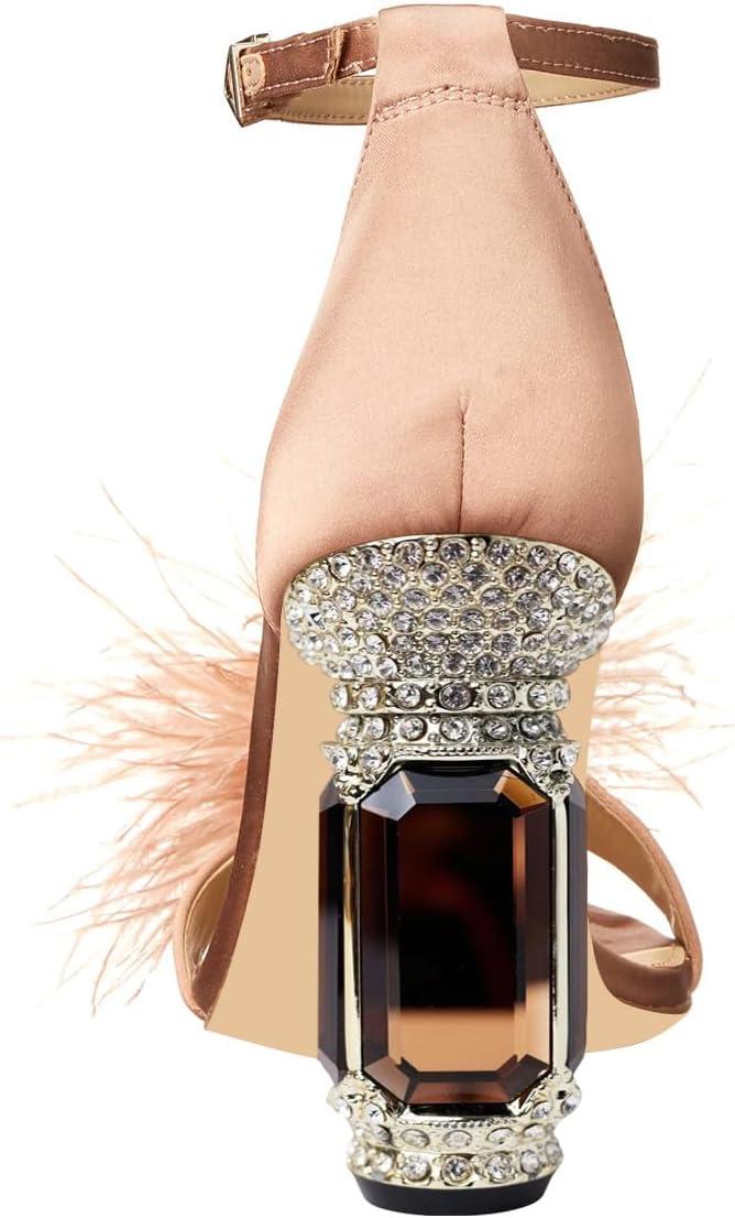 FSJ Women Chic Feather Open Toe Ankle Strap Sandals Crystal Block High Heel Furry Wedding Evening Prom Shoes Size 4-16 US(Champagne)