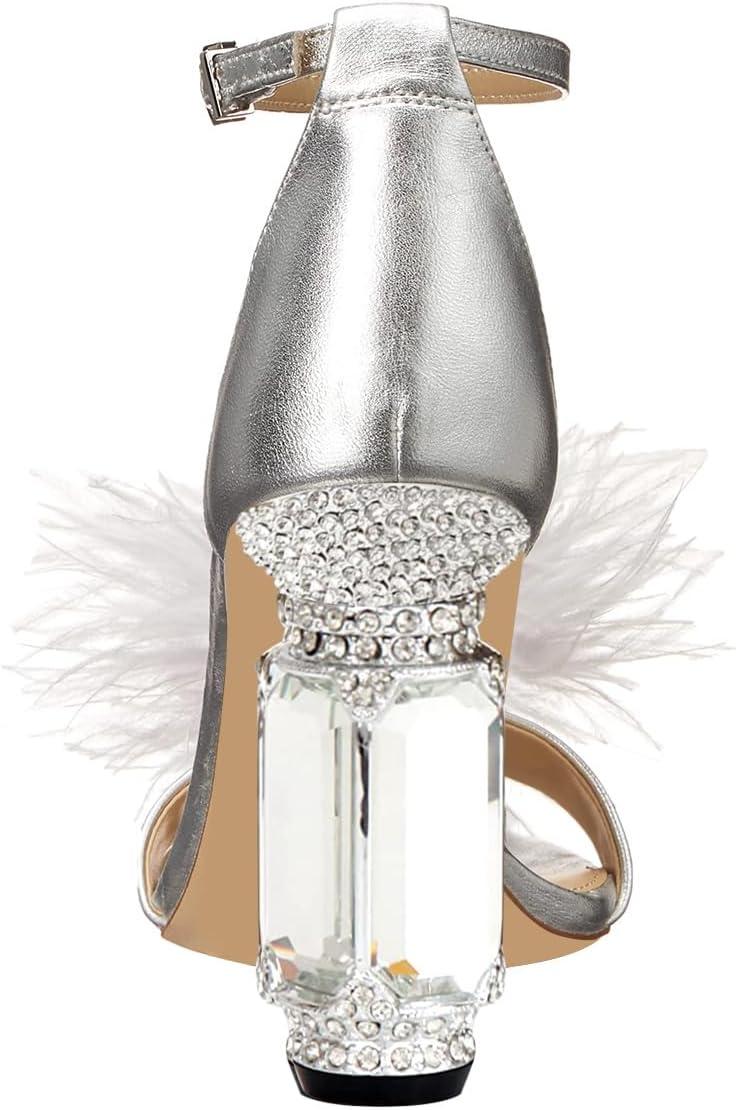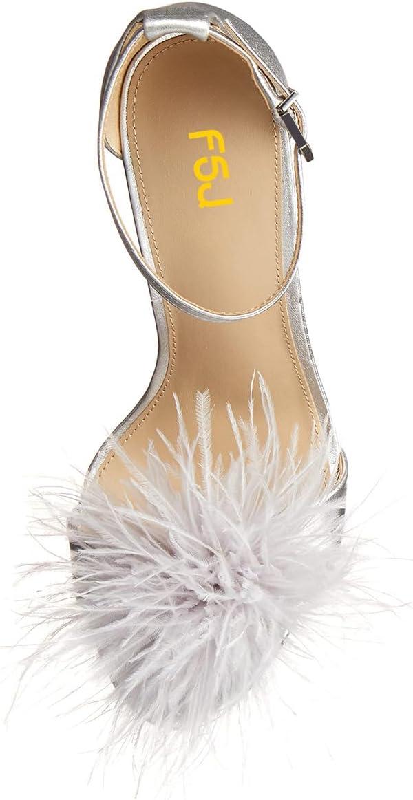 FSJ Women Chic Feather Open Toe Ankle Strap Sandals Crystal Block High Heel Furry Wedding Evening Prom Shoes Size 4-16 US(Silver)