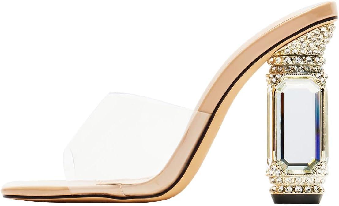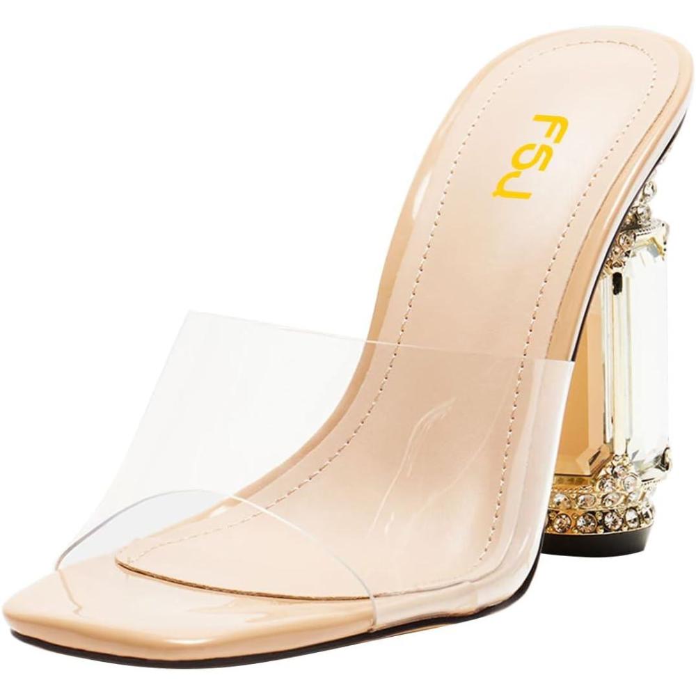 imageFSJ Women Chic Square Open Toe Crystal Heeled Sandals Block Chunky High Heel Slip On Mules Comfortable Casual Dress Sildes Shoes Size 416 USClear