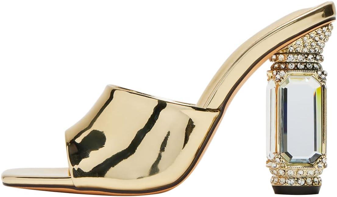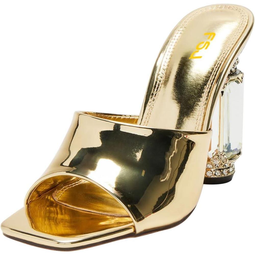 imageFSJ Women Chic Square Open Toe Crystal Heeled Sandals Block Chunky High Heel Slip On Mules Comfortable Casual Dress Sildes Shoes Size 416 USGold