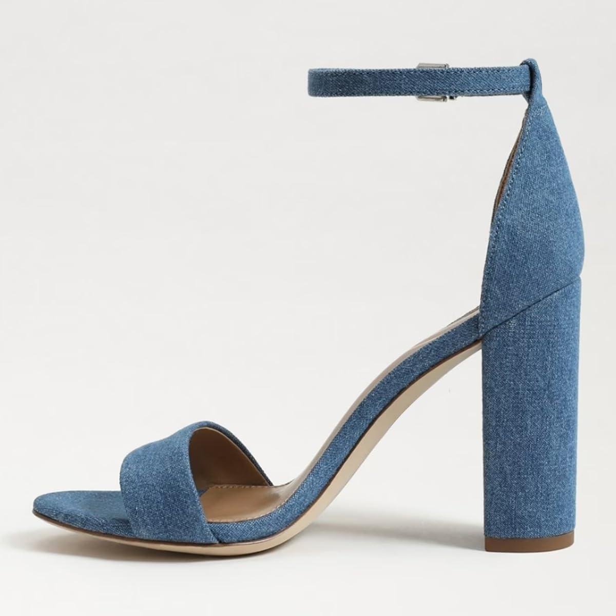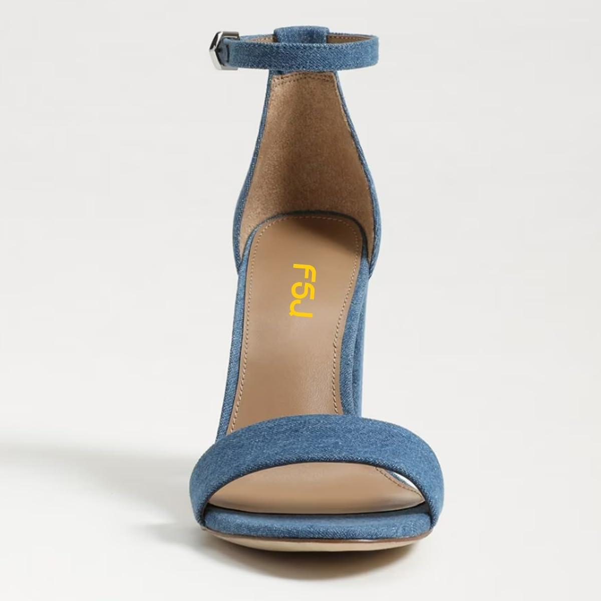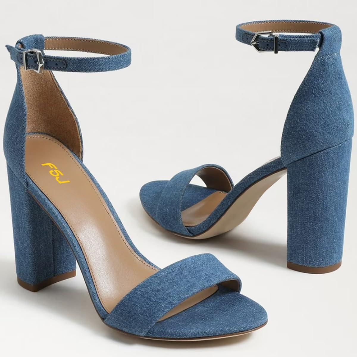 FSJ Women Classic Chunky High Heel Sandals Open Toe Ankle Strap Single Band Dress Wedding Party Sexy Shoes Size 4-15 US(Blue Denim)