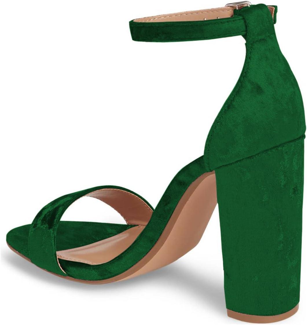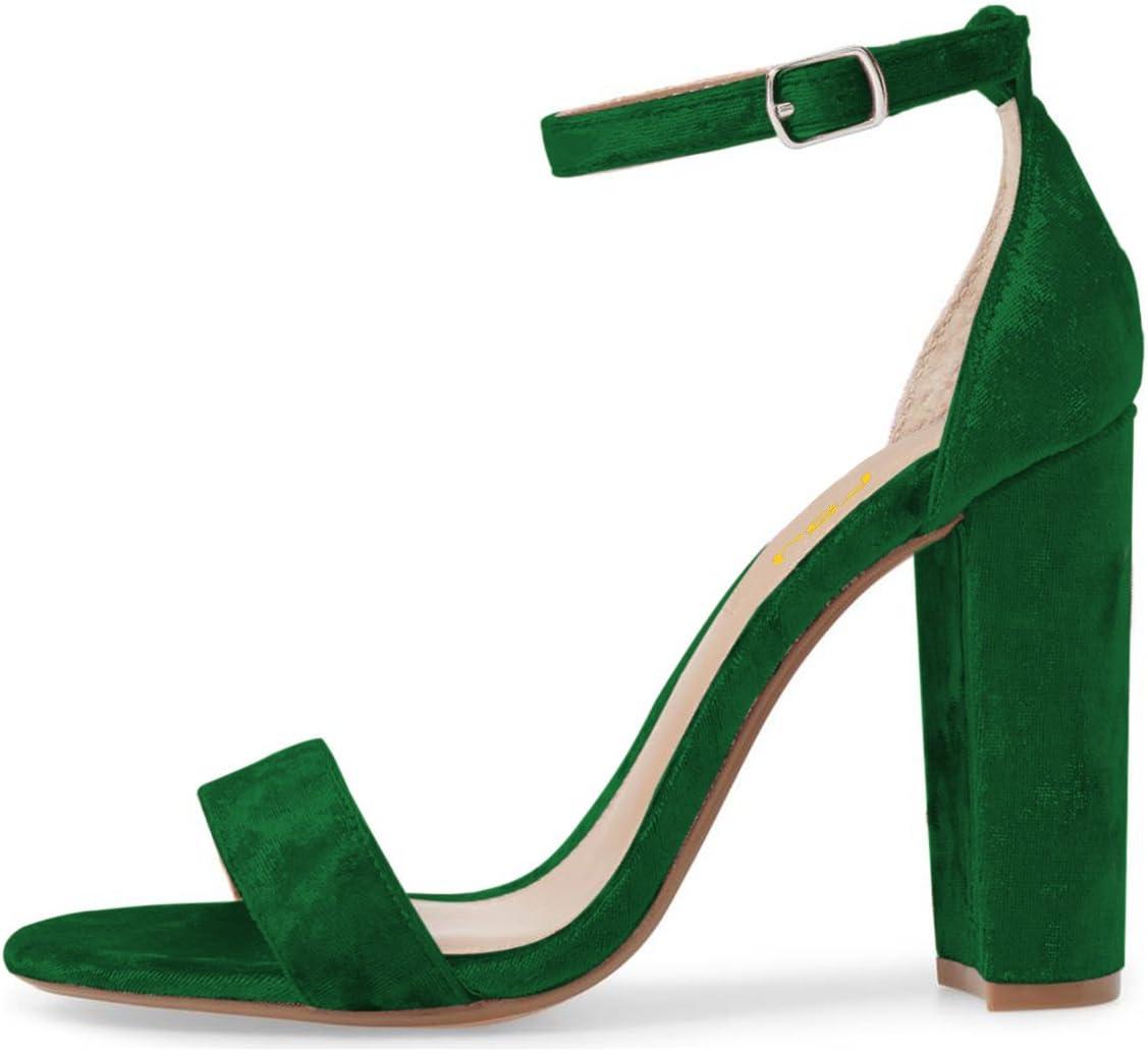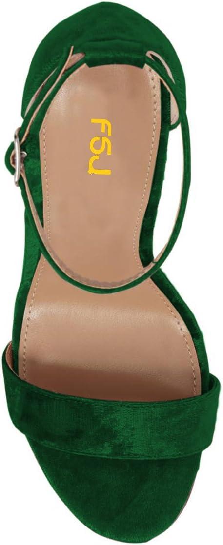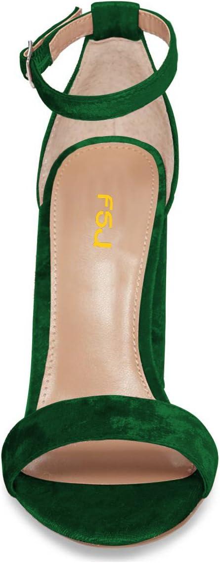 FSJ Women Classic Chunky High Heel Sandals Open Toe Ankle Strap Single Band Dress Wedding Party Sexy Shoes Size 4-15 US(Green Velvet)