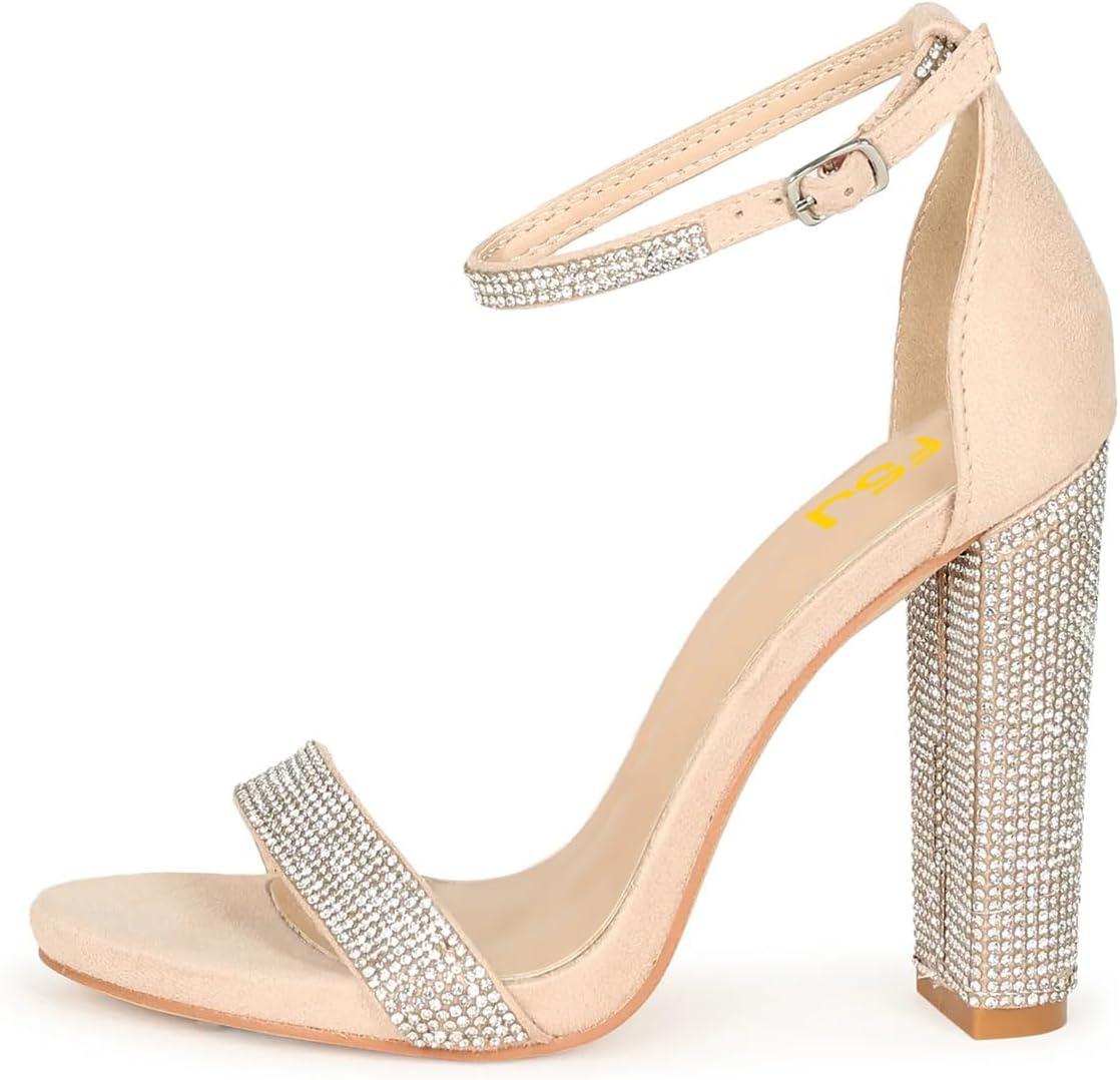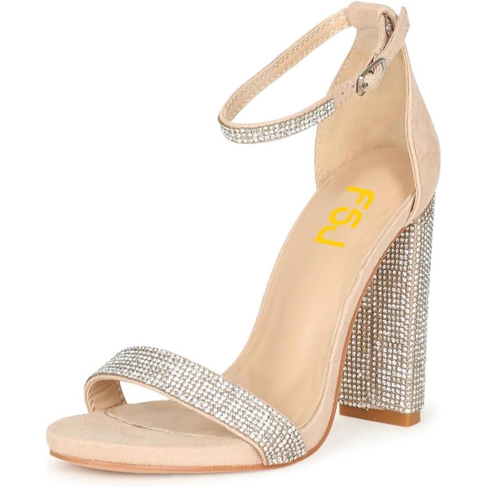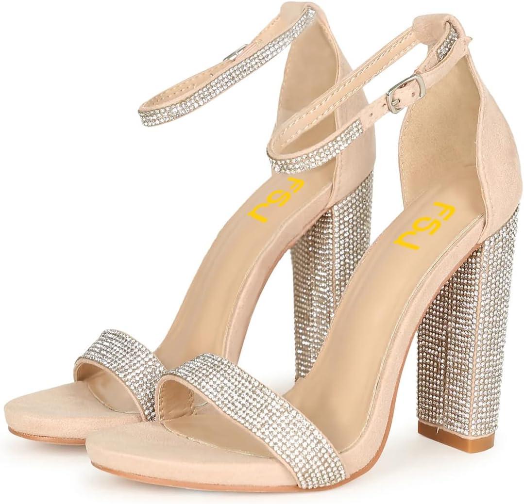 FSJ Women Classic Chunky High Heel Sandals Open Toe Ankle Strap Single Band Dress Wedding Party Sexy Shoes Size 4-15 US(Nude-crystal)