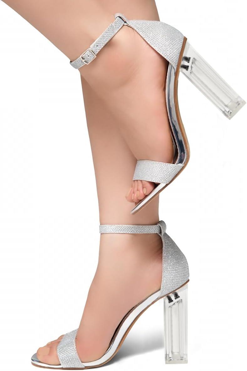 imageFSJ Women Classic Chunky High Heel Sandals Open Toe Ankle Strap Single Band Dress Wedding Party Sexy Shoes Size 415 USSilver Clear Heel