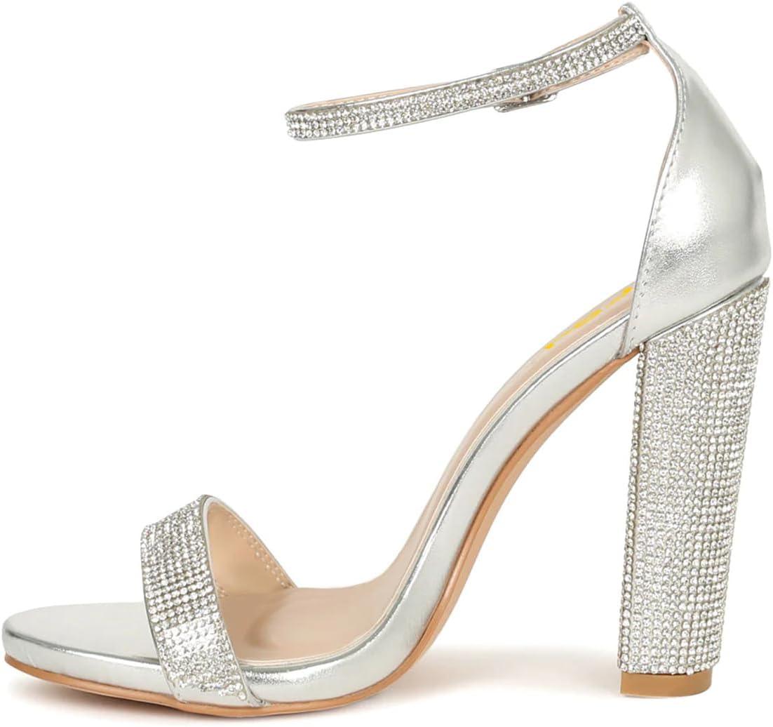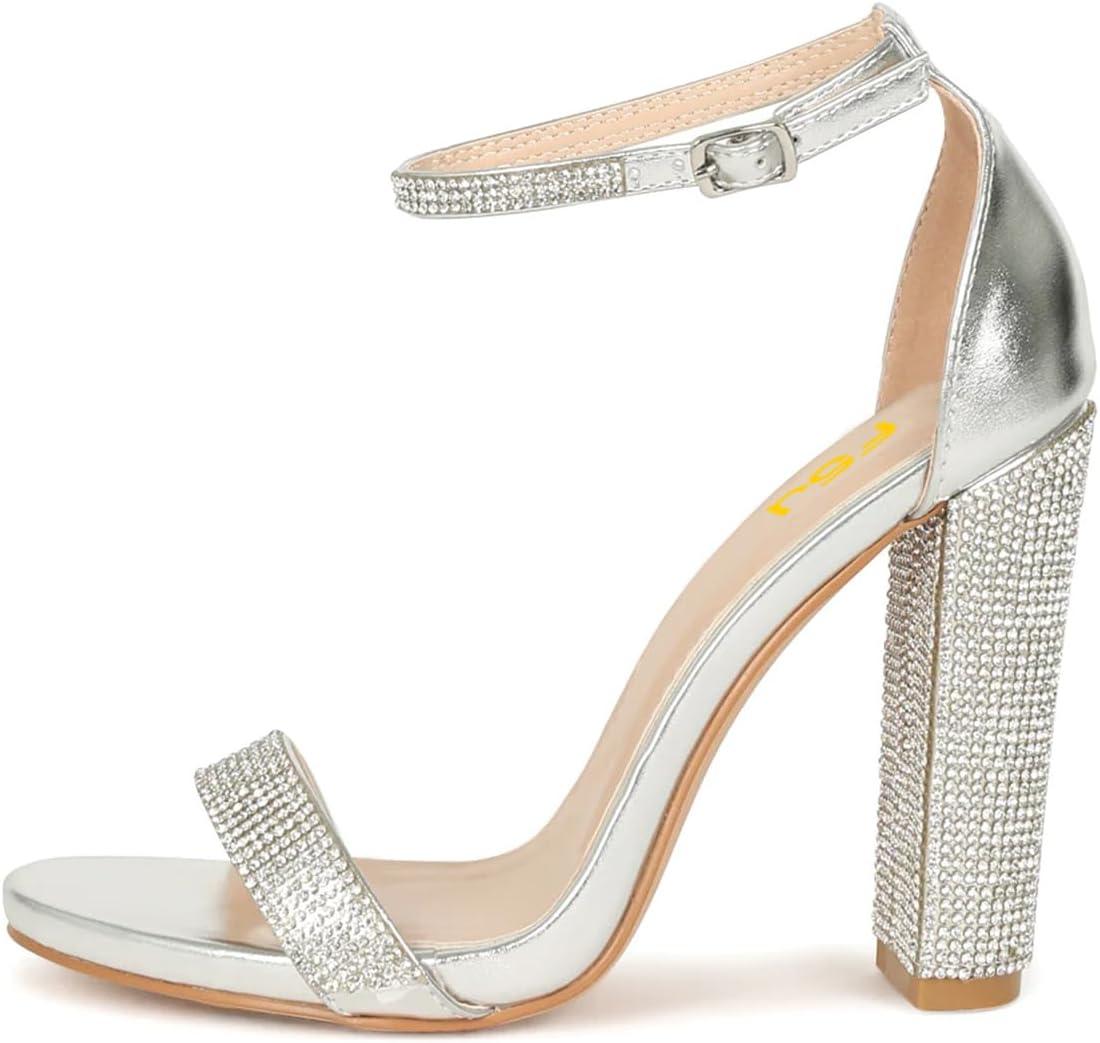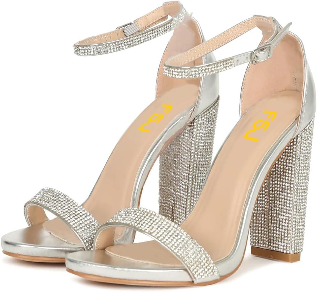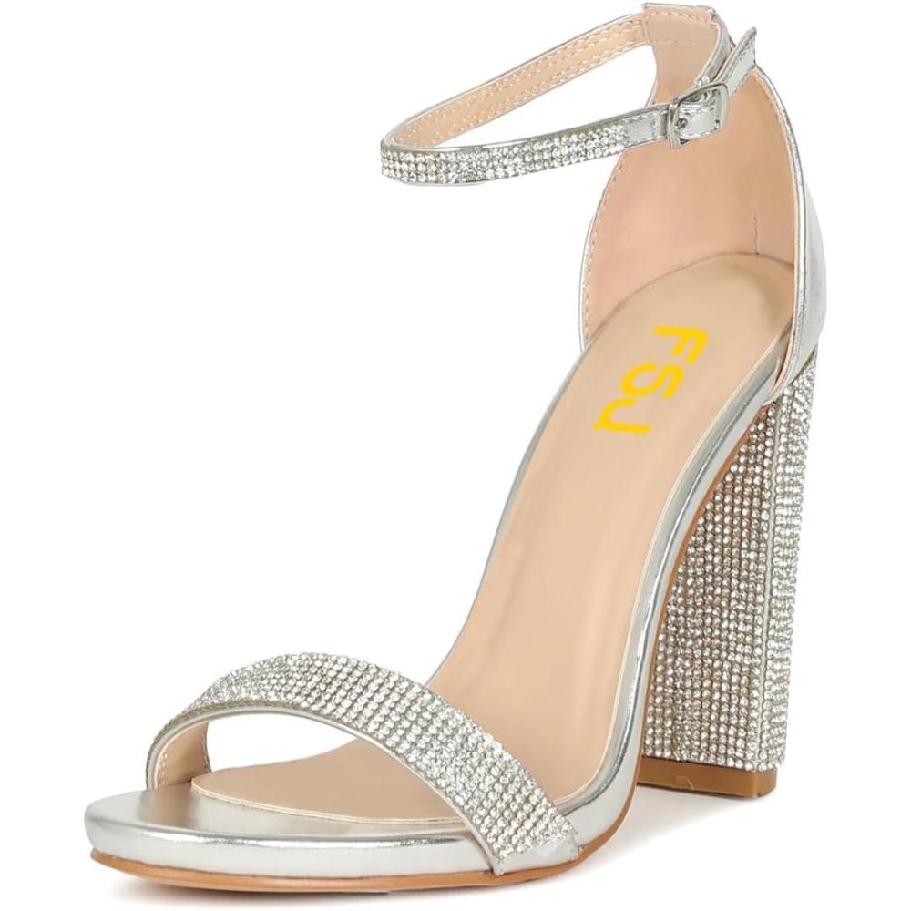 FSJ Women Classic Chunky High Heel Sandals Open Toe Ankle Strap Single Band Dress Wedding Party Sexy Shoes Size 4-15 US(Silver-crystal)