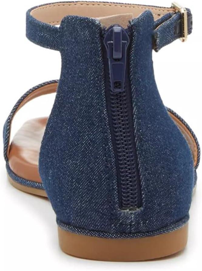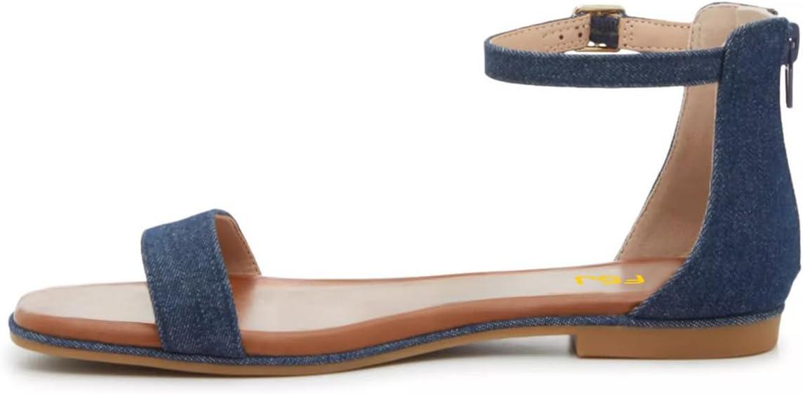 FSJ Women Classic Open Toe Ankle Strap Flat Sandals One Band Buckle Back Zipper Comfort Summer Dressy Shoes Size 4-16 US(Dark Blue Denim)