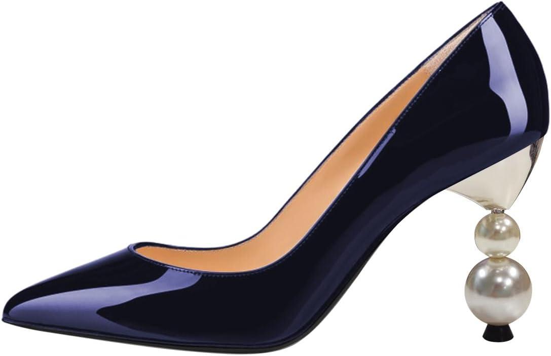 FSJ Women Classic Pearls Heel Pumps Pointed Toe Slip On High Heel 9cm Glossy Leather Ladies Office Party Pump Shoes Size 4-16 US(Blue)