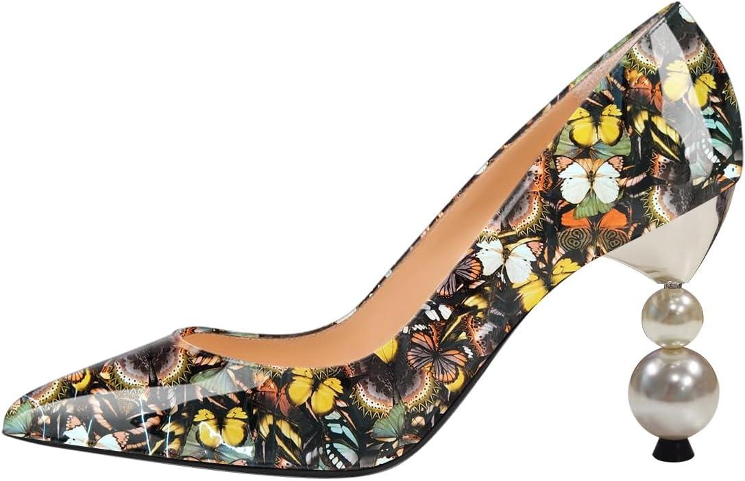 FSJ Women Classic Pearls Heel Pumps Pointed Toe Slip On High Heel 9cm Glossy Leather Ladies Office Party Pump Shoes Size 4-16 US(Butterfly)