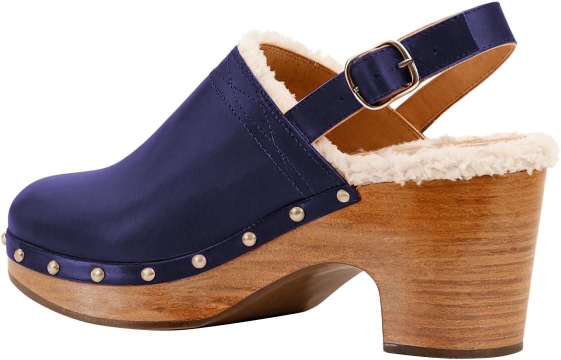 imageFSJ Women Closed Round Toe Clogs Fur Lining Rivets Wooden Chunky Mid Heel Slingback Mules with Studs Comfortable Shoes Size 416 USBlue