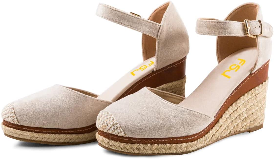 FSJ Women Closed Toe Espadrilles Dressy Wedge Sandal Ankle Strap Buckle High Heels Comfort Platform Sandals Shoes Size 4-15 US(Beige)