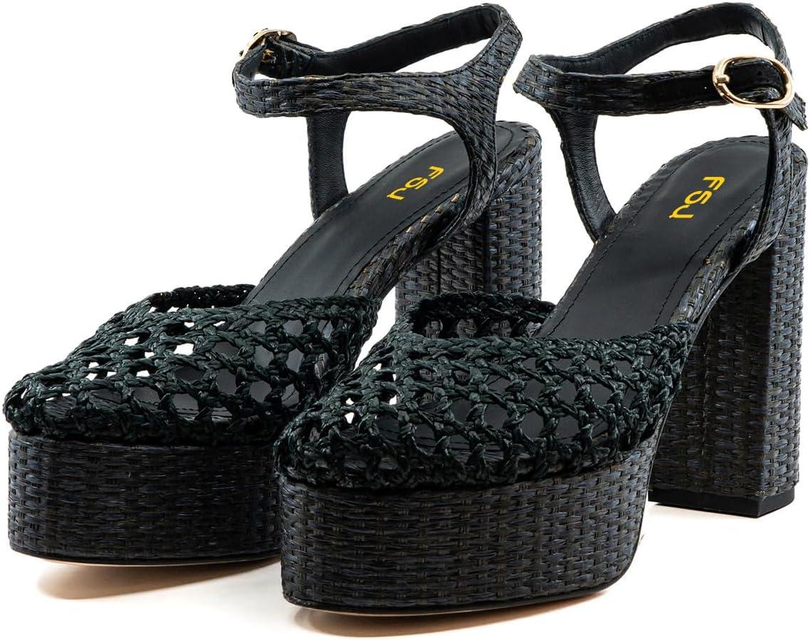 FSJ Women Closed Toe Woven Sandals Summer Platform Chunky High Heel Ankle Strap Chic Hollow Braided Breathable Wedding Shoes Size 4-16 US(Black)