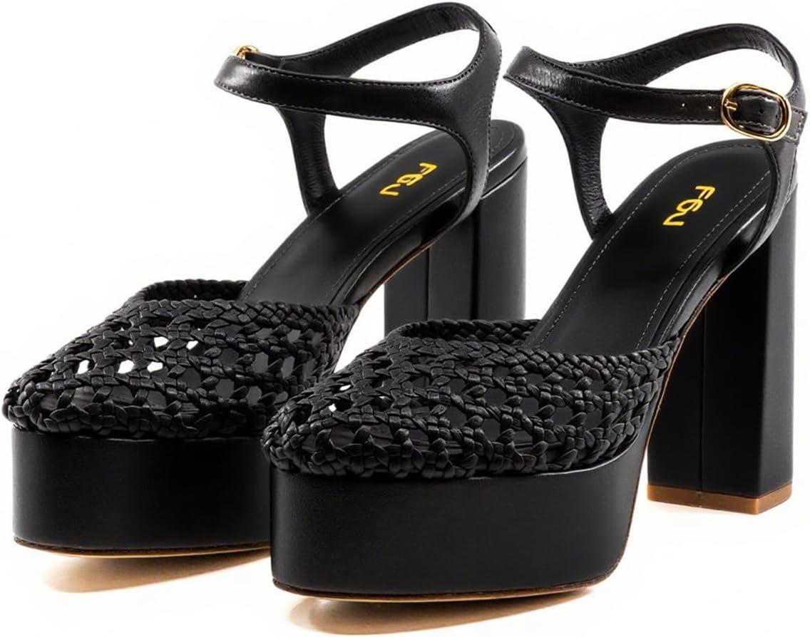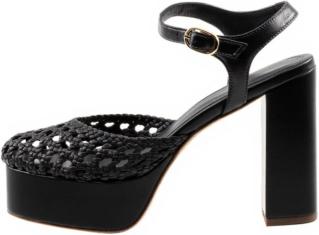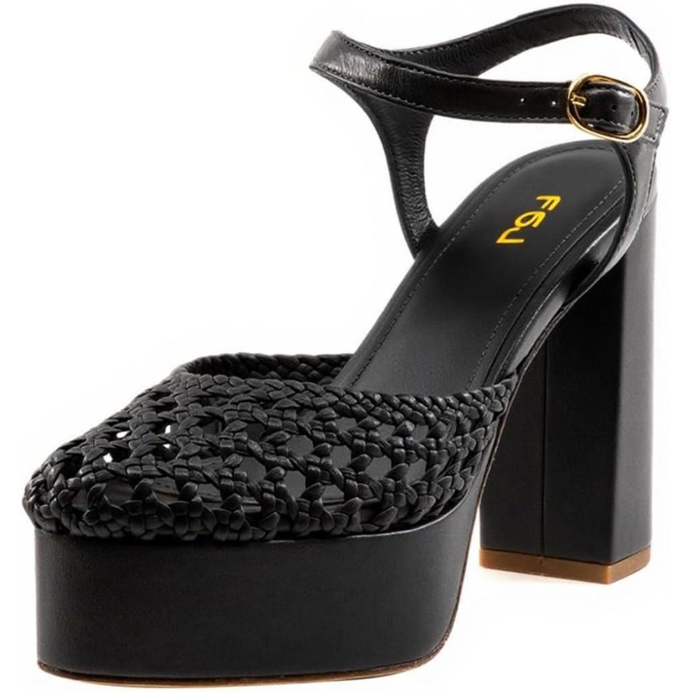 FSJ Women Closed Toe Woven Sandals Summer Platform Chunky High Heel Ankle Strap Chic Hollow Braided Breathable Wedding Shoes Size 4-16 US(Black)