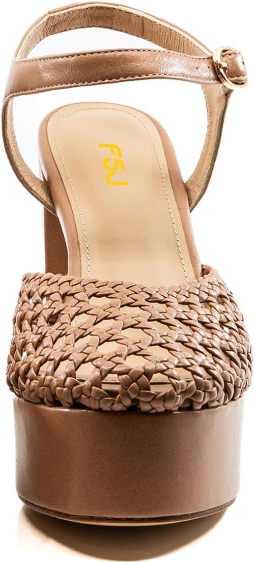 FSJ Women Closed Toe Woven Sandals Summer Platform Chunky High Heel Ankle Strap Chic Hollow Braided Breathable Wedding Shoes Size 4-16 US(Brown)