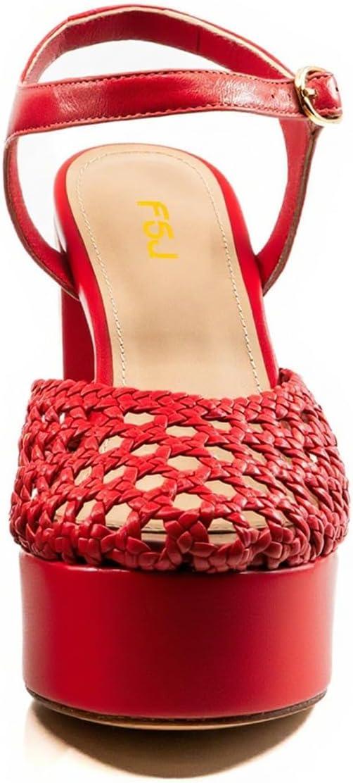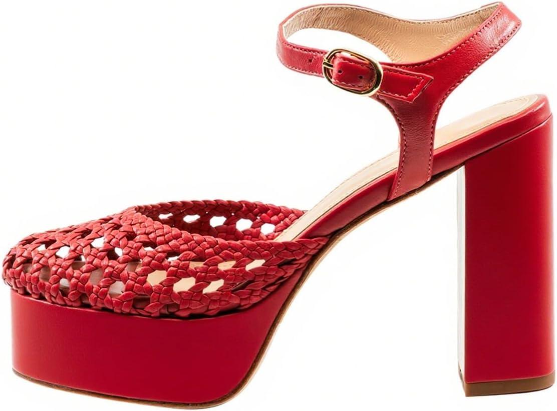 FSJ Women Closed Toe Woven Sandals Summer Platform Chunky High Heel Ankle Strap Chic Hollow Braided Breathable Wedding Shoes Size 4-16 US(Red)