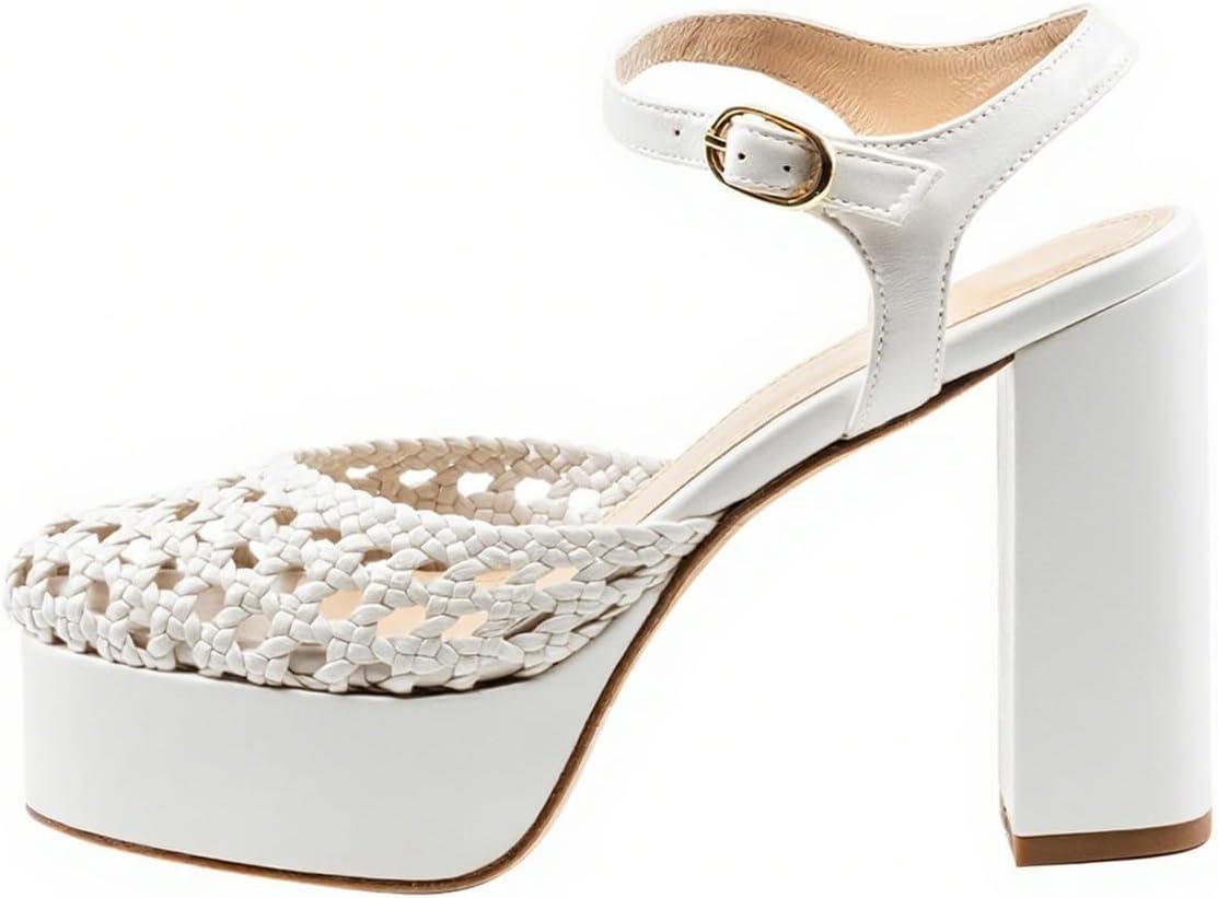 FSJ Women Closed Toe Woven Sandals Summer Platform Chunky High Heel Ankle Strap Chic Hollow Braided Breathable Wedding Shoes Size 4-16 US(White)