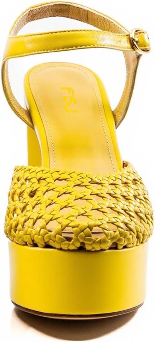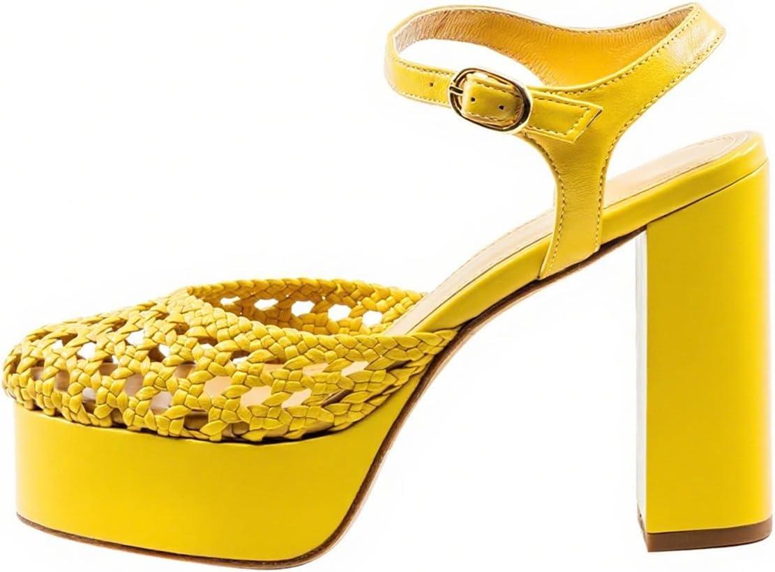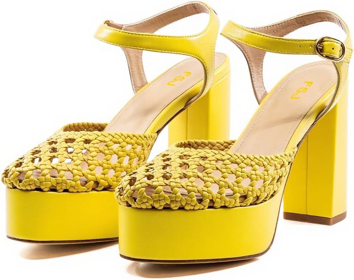 FSJ Women Closed Toe Woven Sandals Summer Platform Chunky High Heel Ankle Strap Chic Hollow Braided Breathable Wedding Shoes Size 4-16 US(Yellow)