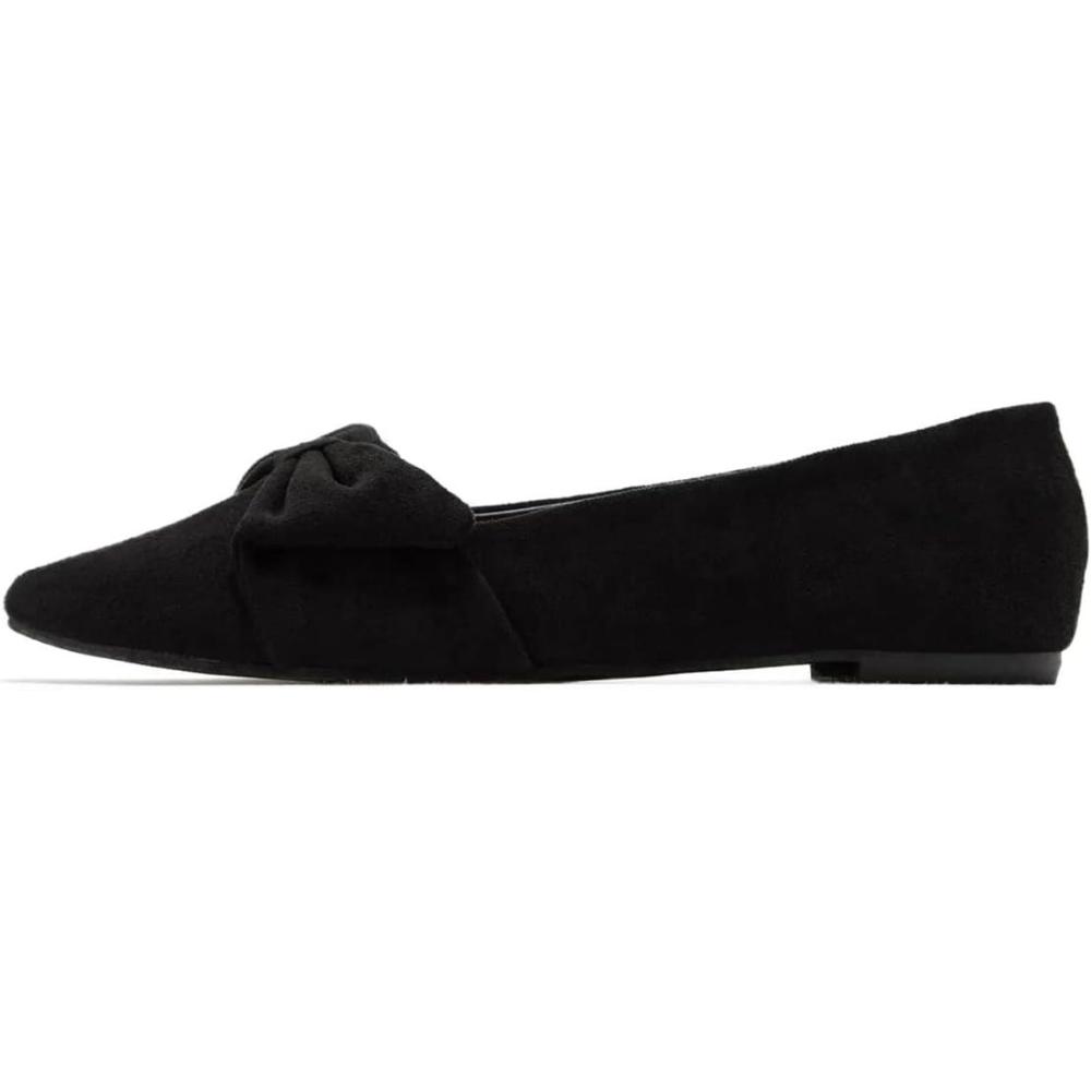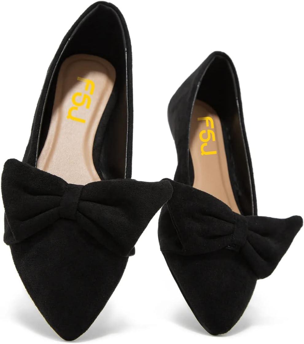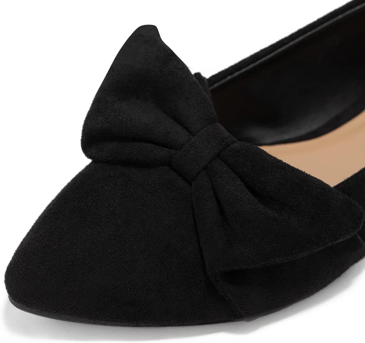 FSJ Women Comfy Bowknot Pointed Toe Suede Flats Slip On Low Heels Pumps Graceful Casual Dress Daily Office Walking Shoes Size 4-16 US(Black)