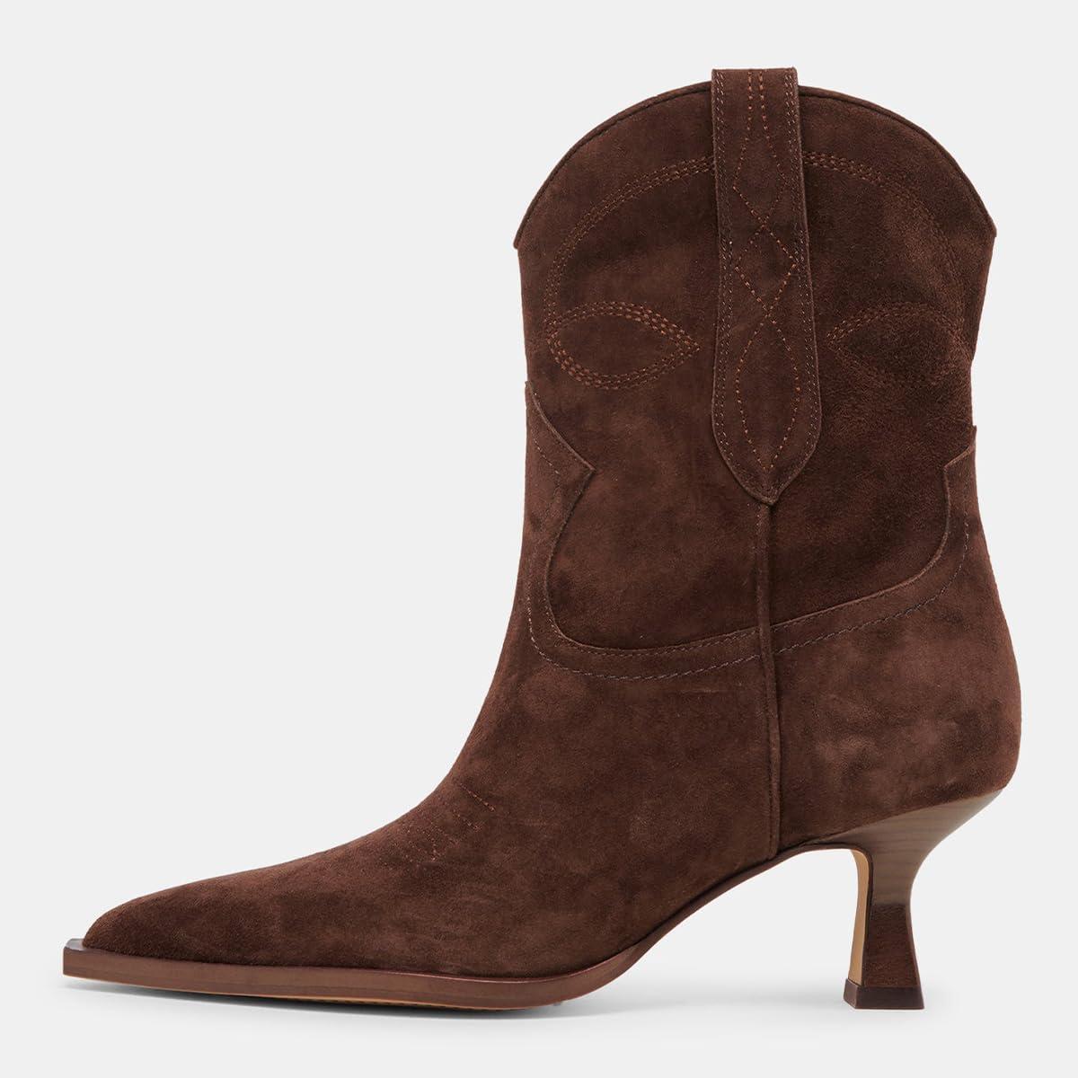 FSJ Women Cowboy Ankle Boots Pointed Toe Kitten Heel Western Pull On Low Heel Booties Embroidery Fall Winter Cowgirl Dress Shoes Size 4-16 US(Chocolate Brown)