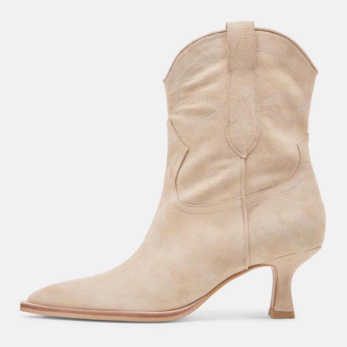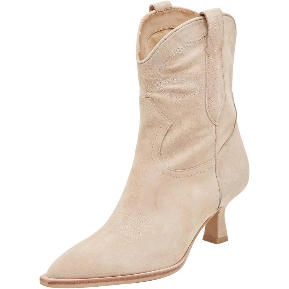FSJ Women Cowboy Ankle Boots Pointed Toe Kitten Heel Western Pull On Low Heel Booties Embroidery Fall Winter Cowgirl Dress Shoes Size 4-16 US(Light Khaki)