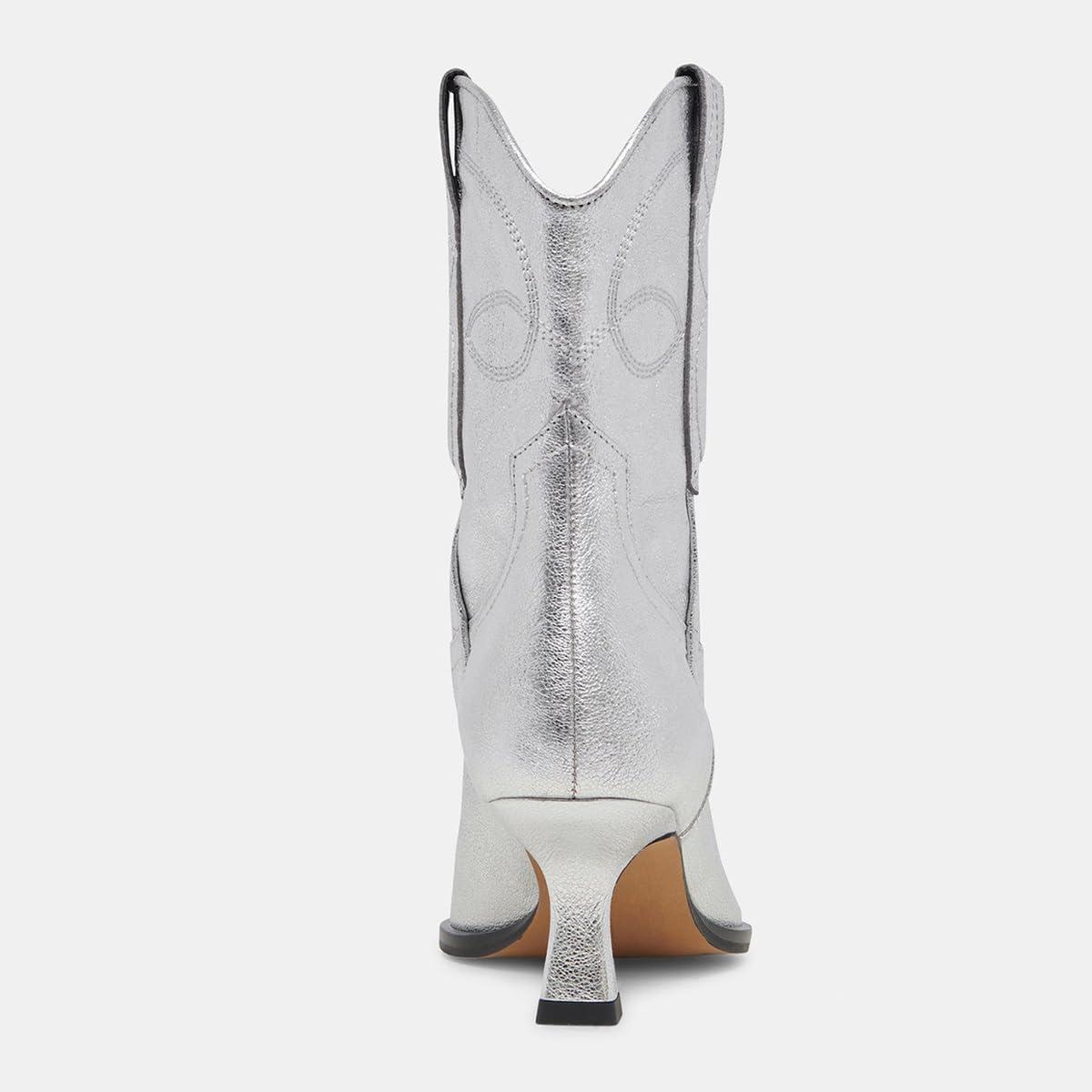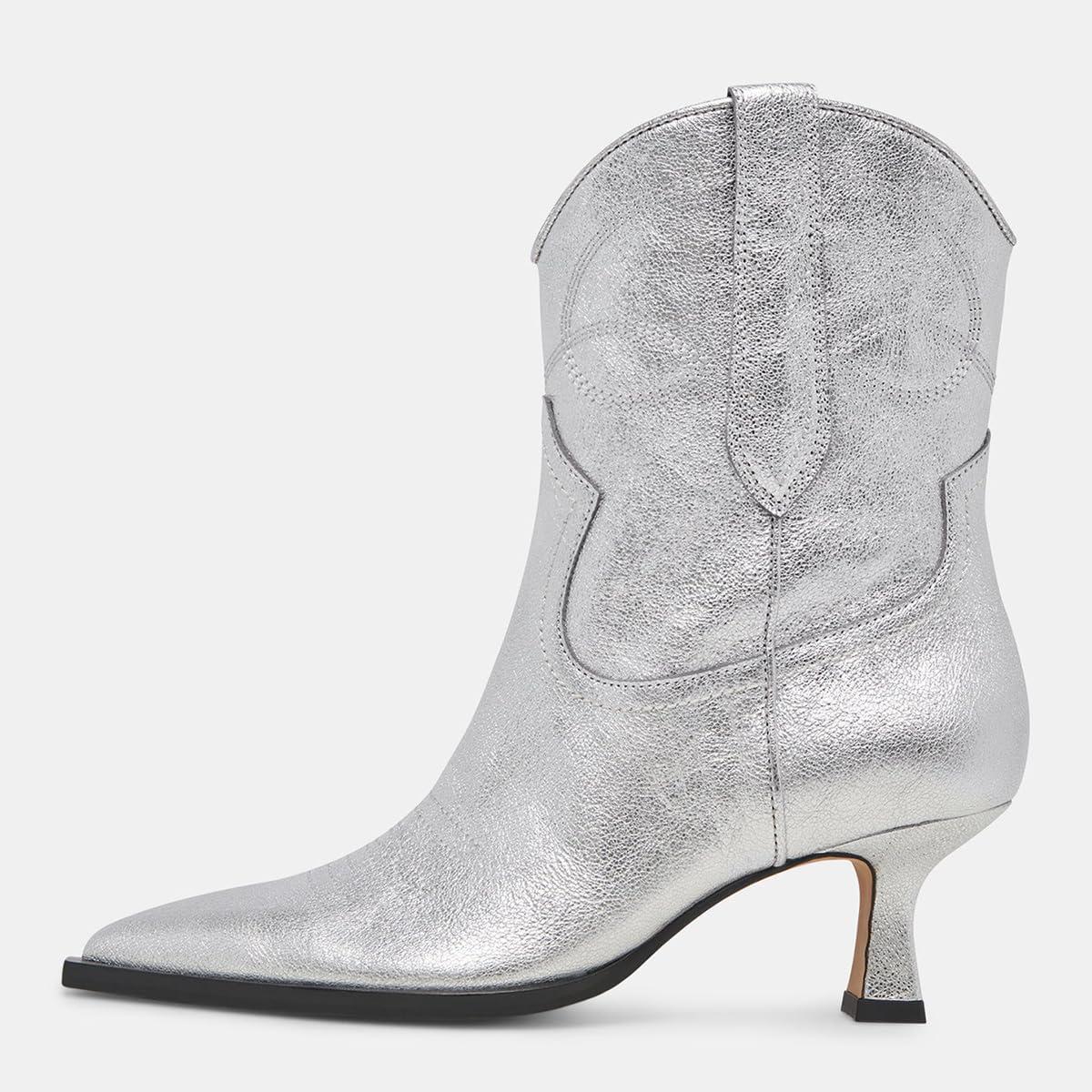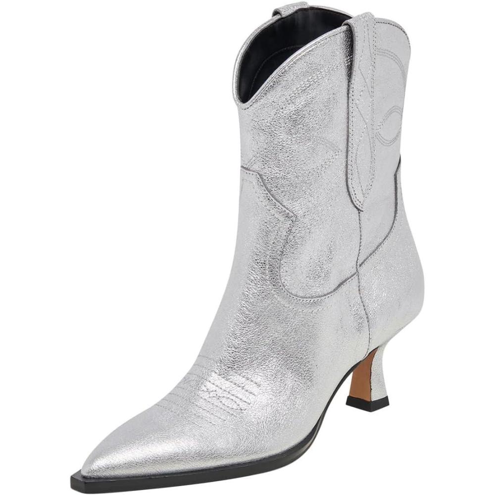 FSJ Women Cowboy Ankle Boots Pointed Toe Kitten Heel Western Pull On Low Heel Booties Embroidery Fall Winter Cowgirl Dress Shoes Size 4-16 US(Silver)