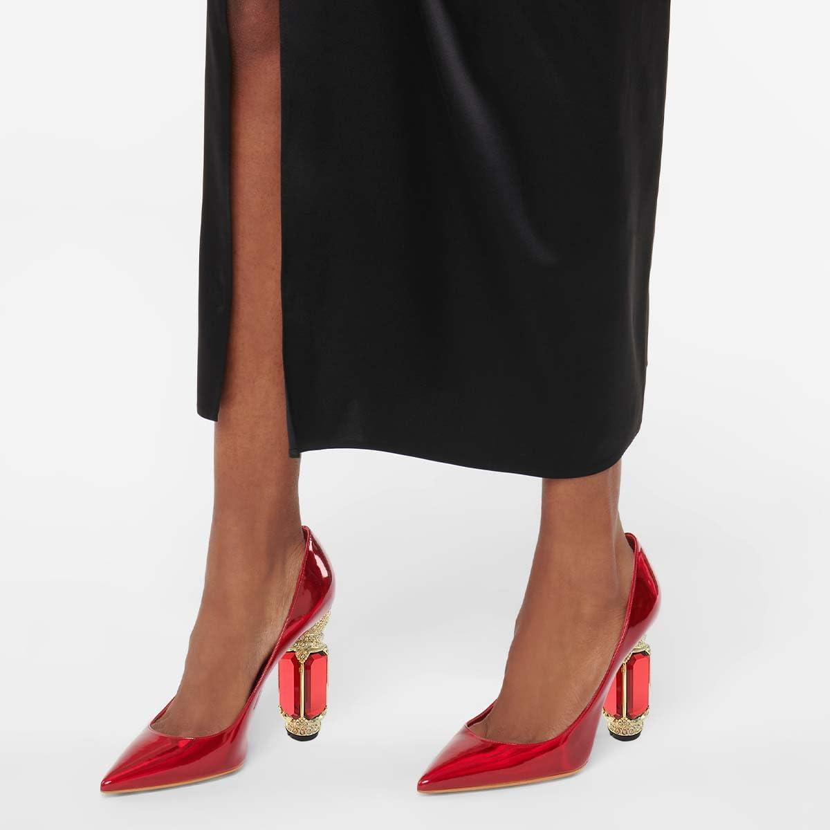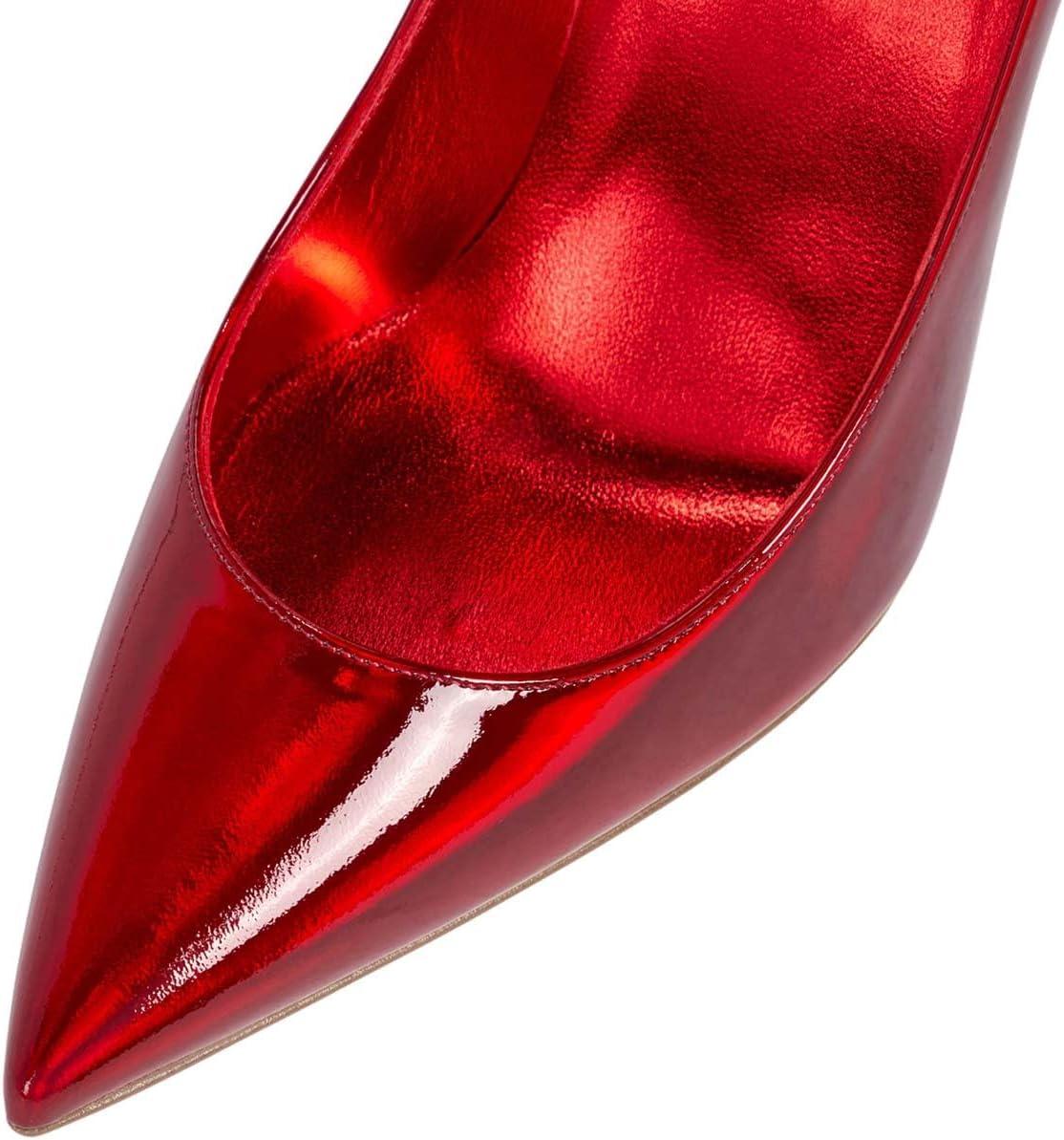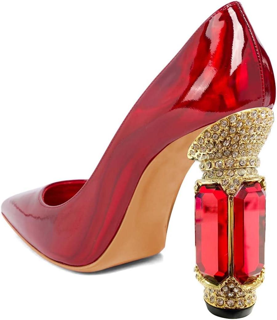 imageFSJ Women Crystal Chunky High Heel Pumps Closed Pointed Toe Sexy Block Heels with Rhinestones Slip On Bridal Party Wedding Dress Shoes Size 416 USRed Mirror Leather