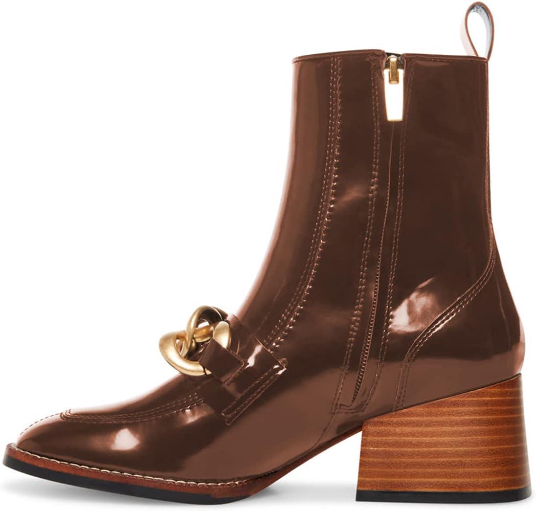 FSJ Women Fashion Chain Square Toe Block Mid Heel Ankle Boots Classic Side Zipper Casual Walking Ladies Shoes Size 4-15 US(Brown)