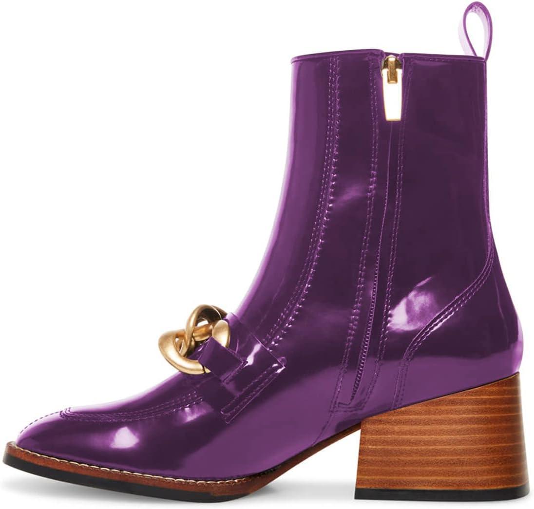 FSJ Women Fashion Chain Square Toe Block Mid Heel Ankle Boots Classic Side Zipper Casual Walking Ladies Shoes Size 4-15 US(Purple)