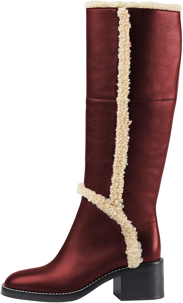 FSJ Women Fashion Knee High Round Toe Mid Chunky Block Heel Riding Dress Winter Wool Spring Shaft Boots(Red Wine)