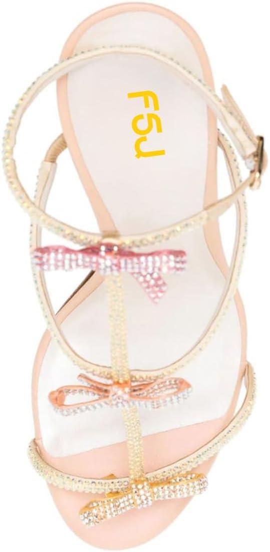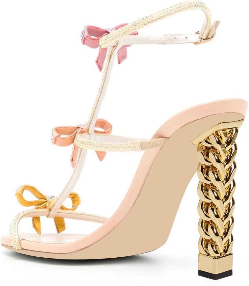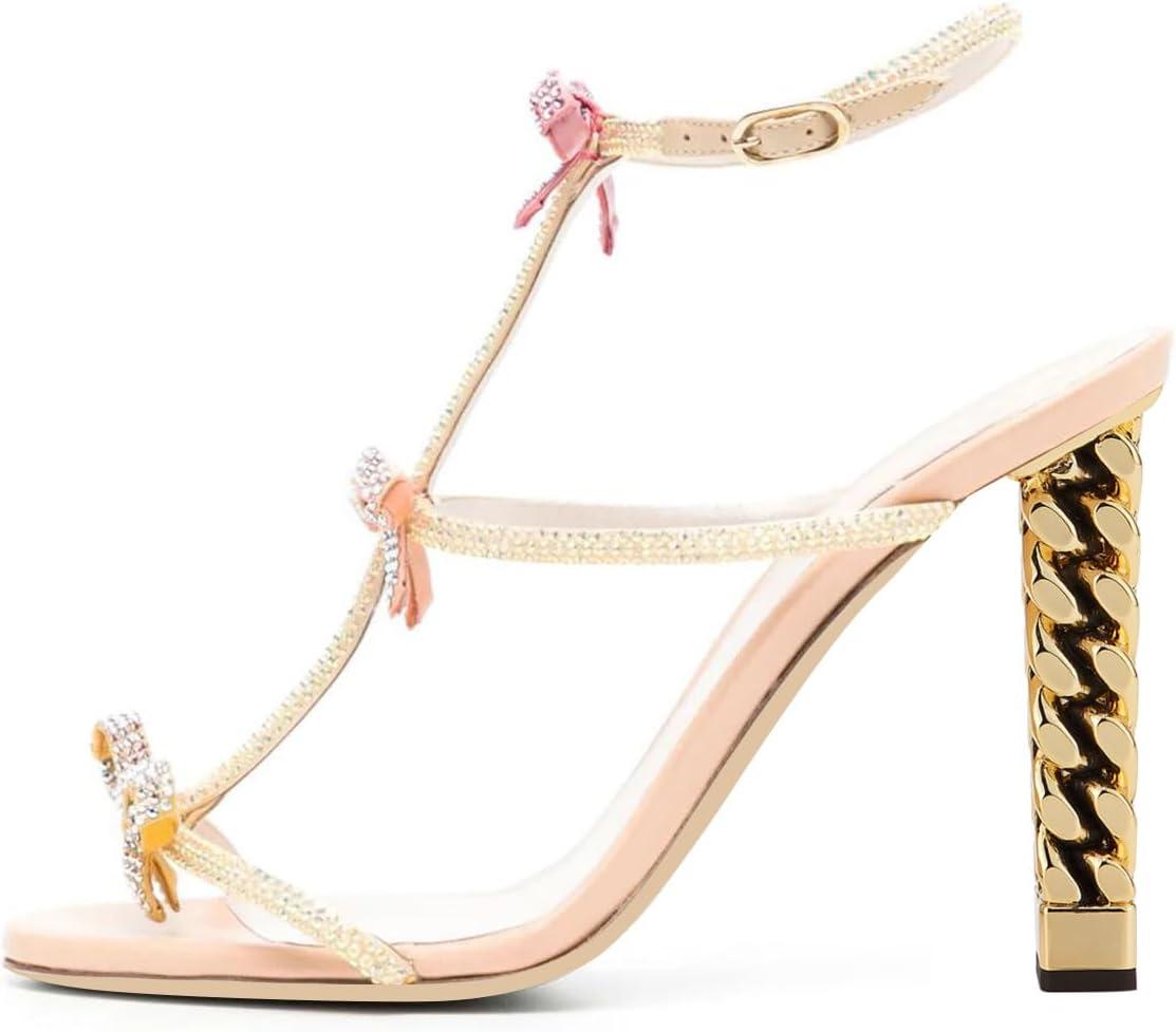 FSJ Women Gold Metal Chain Thick High Heel Sandals Open Toe Strappy Ankle Buckle Strap Slingback Comfy Summer Dress Pumps Crystal Bows Size 4-15 US(Nude Black Bows)