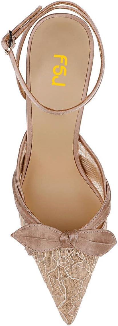 FSJ Women Lace High Heel Bowknot Closed Pointed Toe Pumps Ankle Strap D’Orsay Heeled Sandals Wedding Bridal Satin Shoes Size 4-16 US(Champagne)