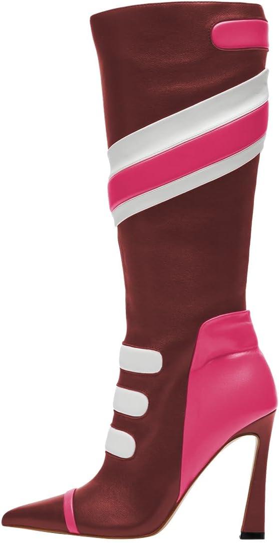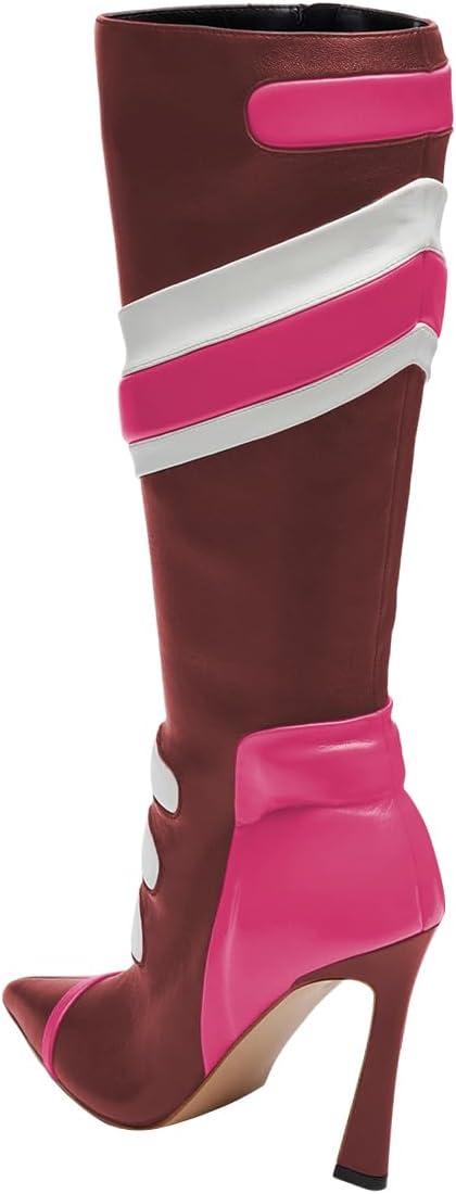 FSJ Women Multicolor Knee High Boots Pointed Toe Tall High Heel Long Boots Side Zipper Novel Color Matching Party Fancy Shoes Size 4-16 US(Pink)