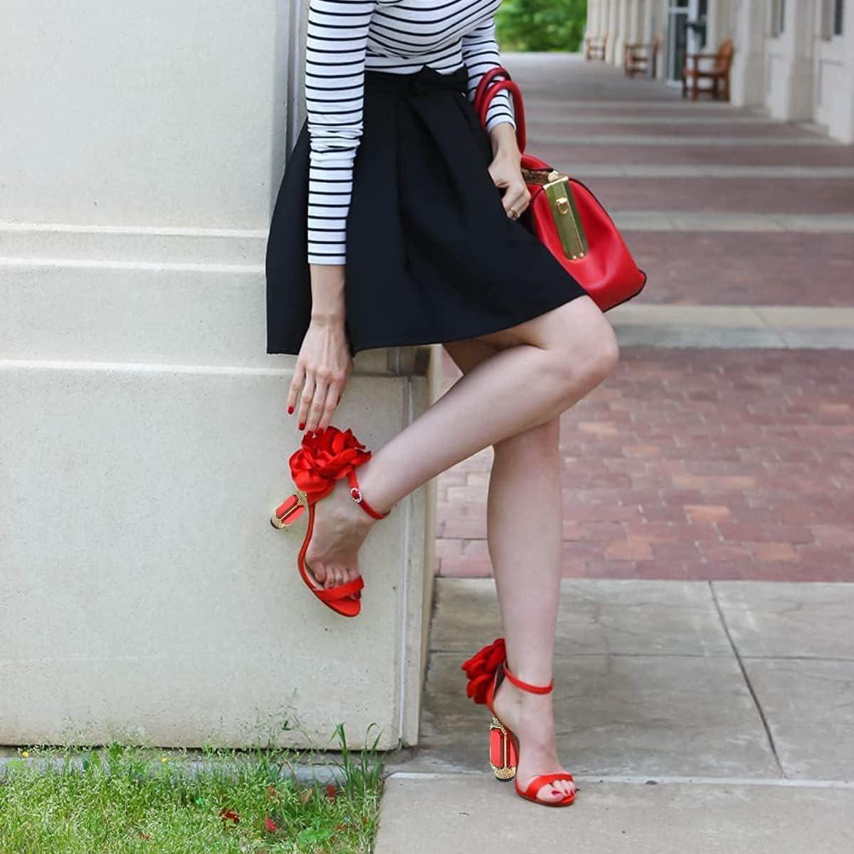 FSJ Women Open Toe Stylish Sandals Ankle Strap Chunky Block High Thick Heels Wedding Party Ballroom Shoes Size 4-15 US(Red Mesh)