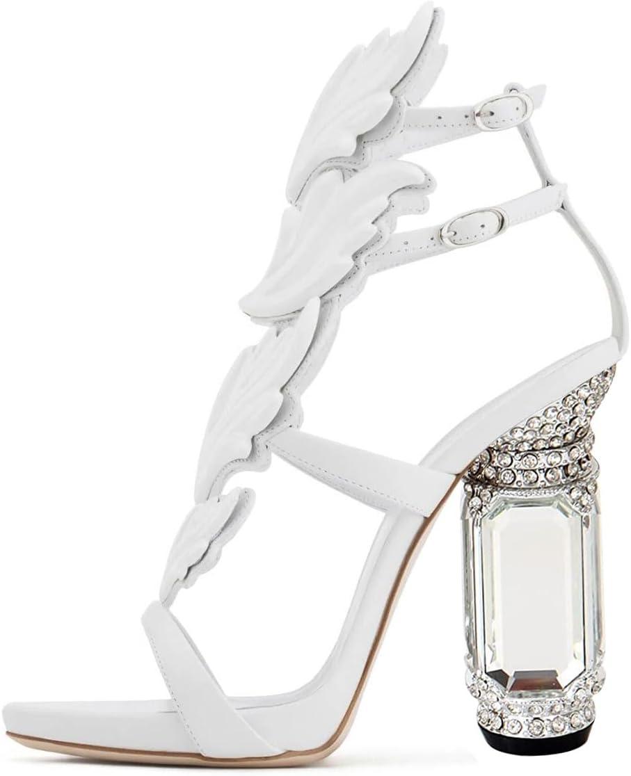 FSJ Women Open Toe Stylish Sandals Ankle Strap Chunky Block High Thick Heels Wedding Party Ballroom Shoes Size 4-15 US(White Feather)