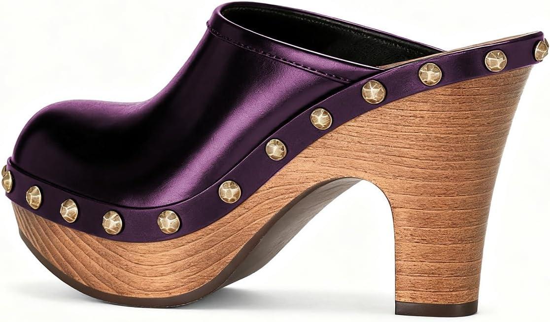 imageFSJ Women Platform Mules Closed Round Toe Studded Slip On Clogs Wooden Chunky Heel Slide Sandals Dressy Casual Shoes Size 416 USPurple