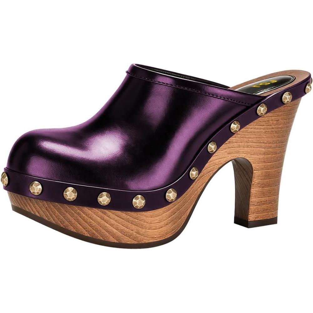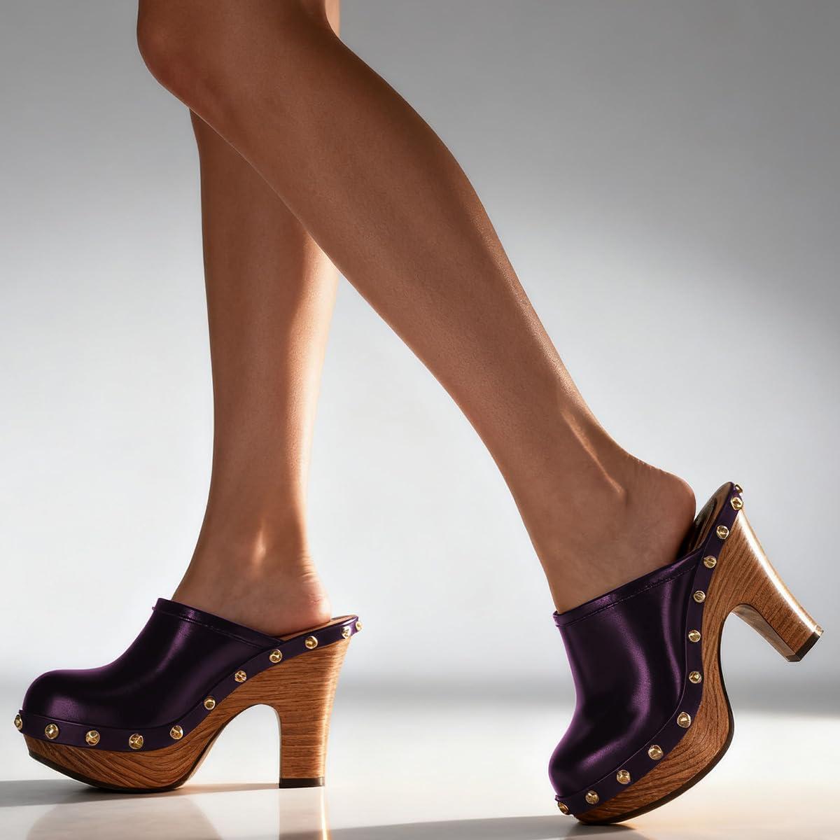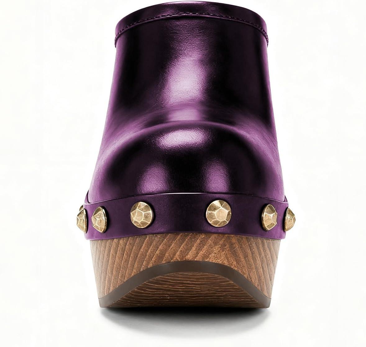 FSJ Women Platform Mules Closed Round Toe Studded Slip On Clogs Wooden Chunky Heel Slide Sandals Dressy Casual Shoes Size 4-16 US(Purple)