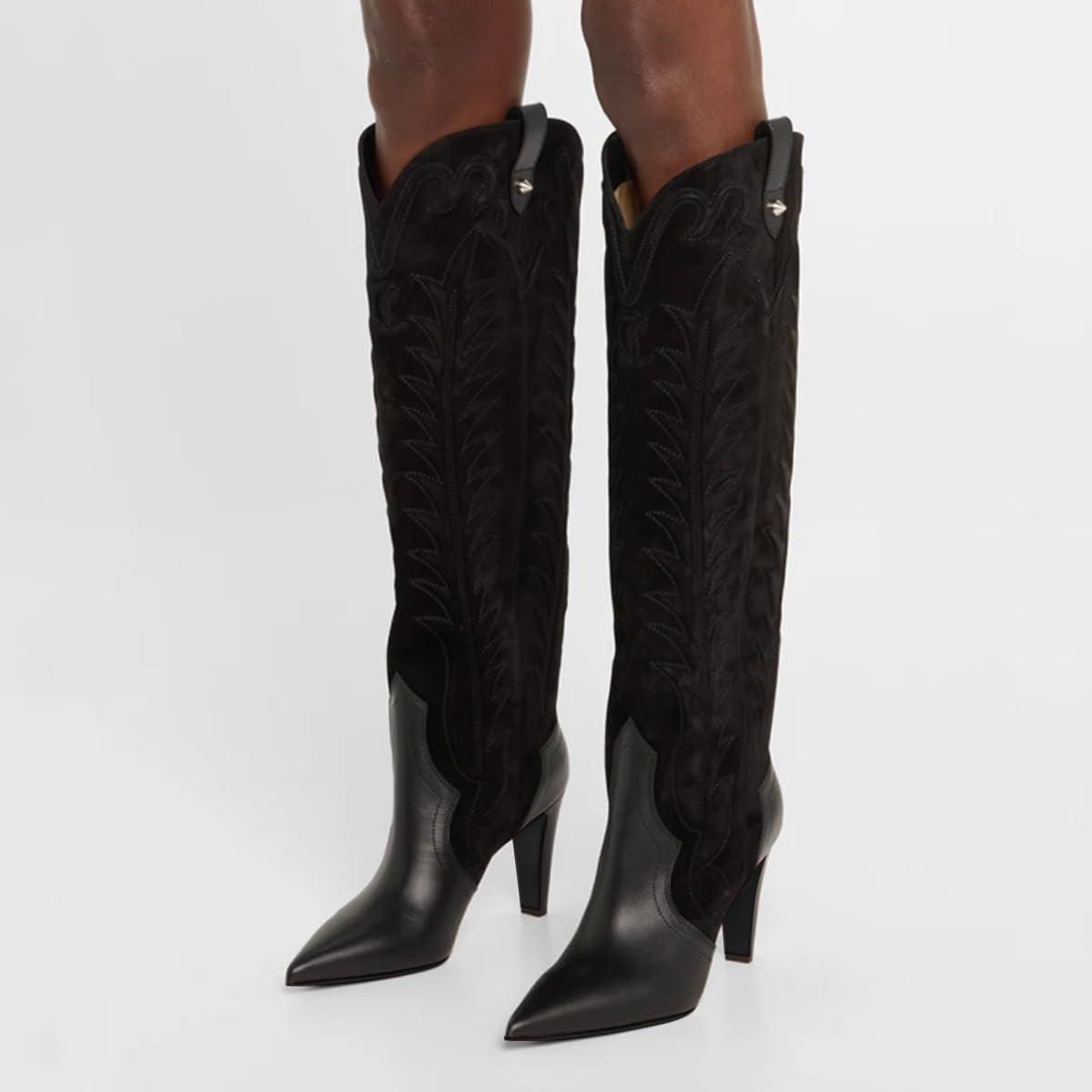 FSJ Women Pointed Toe Cowboy Boots Embroidered Chunky High Heel Knee High Boots Western Pull On Fashion Dress Shoes Size 4-16 US(Black)