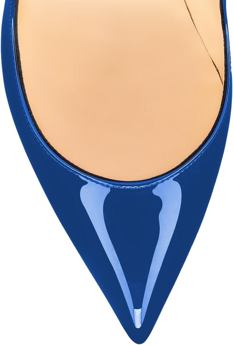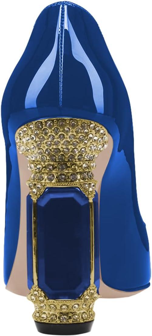 FSJ Women Pointed Toe Crystal High Heel Pumps Comfort Slip On Chunky Block Heel Bridal Wedding Evening Party Prom Shoes Size 4-15 US(Blue Patent)