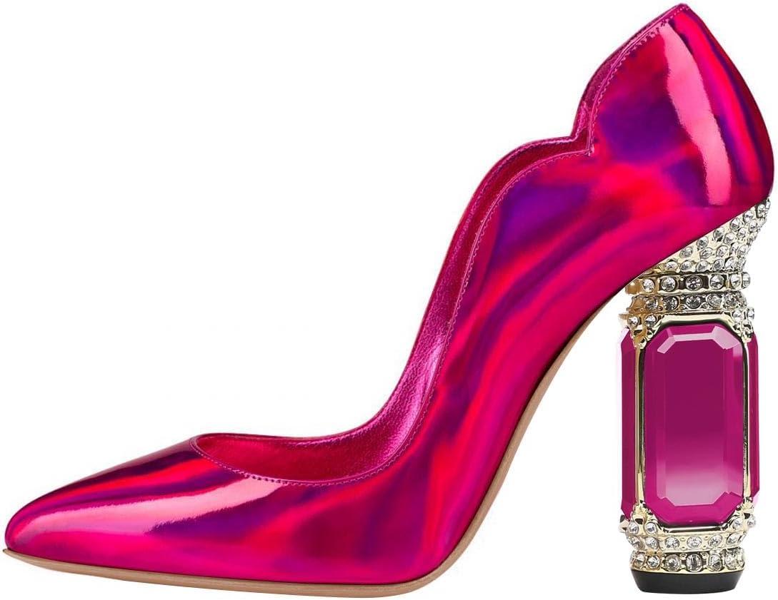 FSJ Women Pointed Toe Crystal High Heel Pumps Comfort Slip On Chunky Block Heel Bridal Wedding Evening Party Prom Shoes Size 4-15 US(Fushcia Mirror)