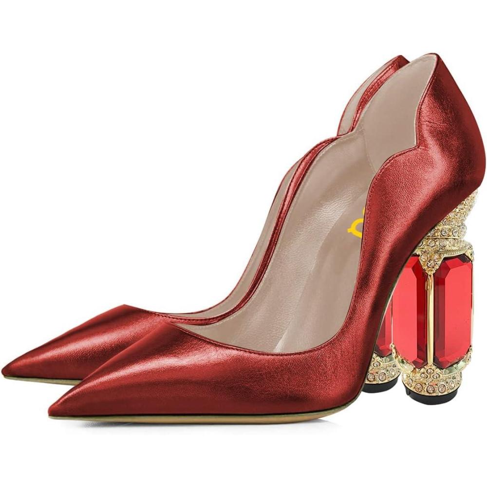 FSJ Women Pointed Toe Crystal High Heel Pumps Comfort Slip On Chunky Block Heel Bridal Wedding Evening Party Prom Shoes Size 4-15 US(Red Mirror)